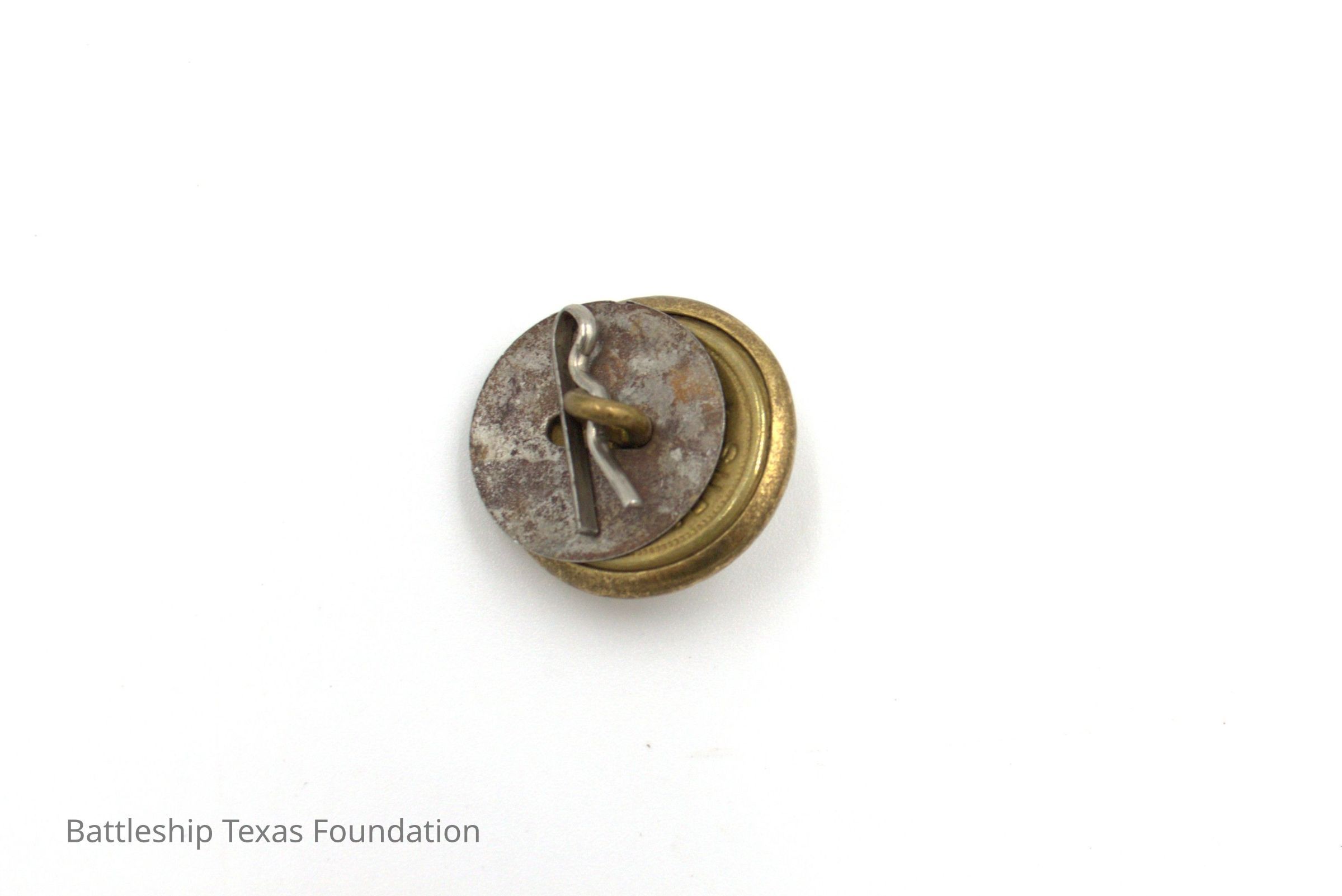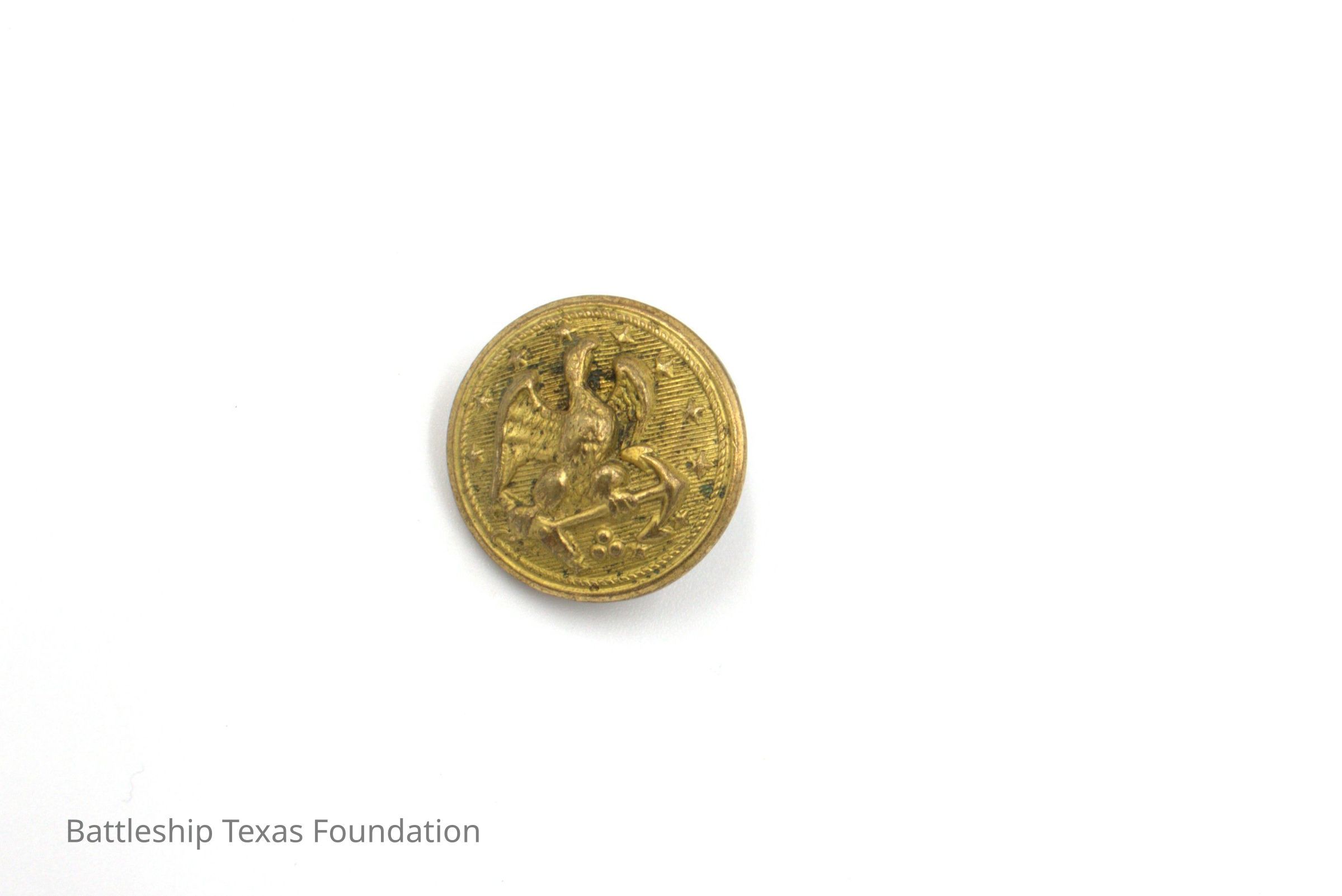 One of fifty-two individual gold buttons owned by Charles R. Pratt as spares for his USN overcoats. Button features an eagle perched on an anchor on the front. Button made by N.S. Meyers in New York.