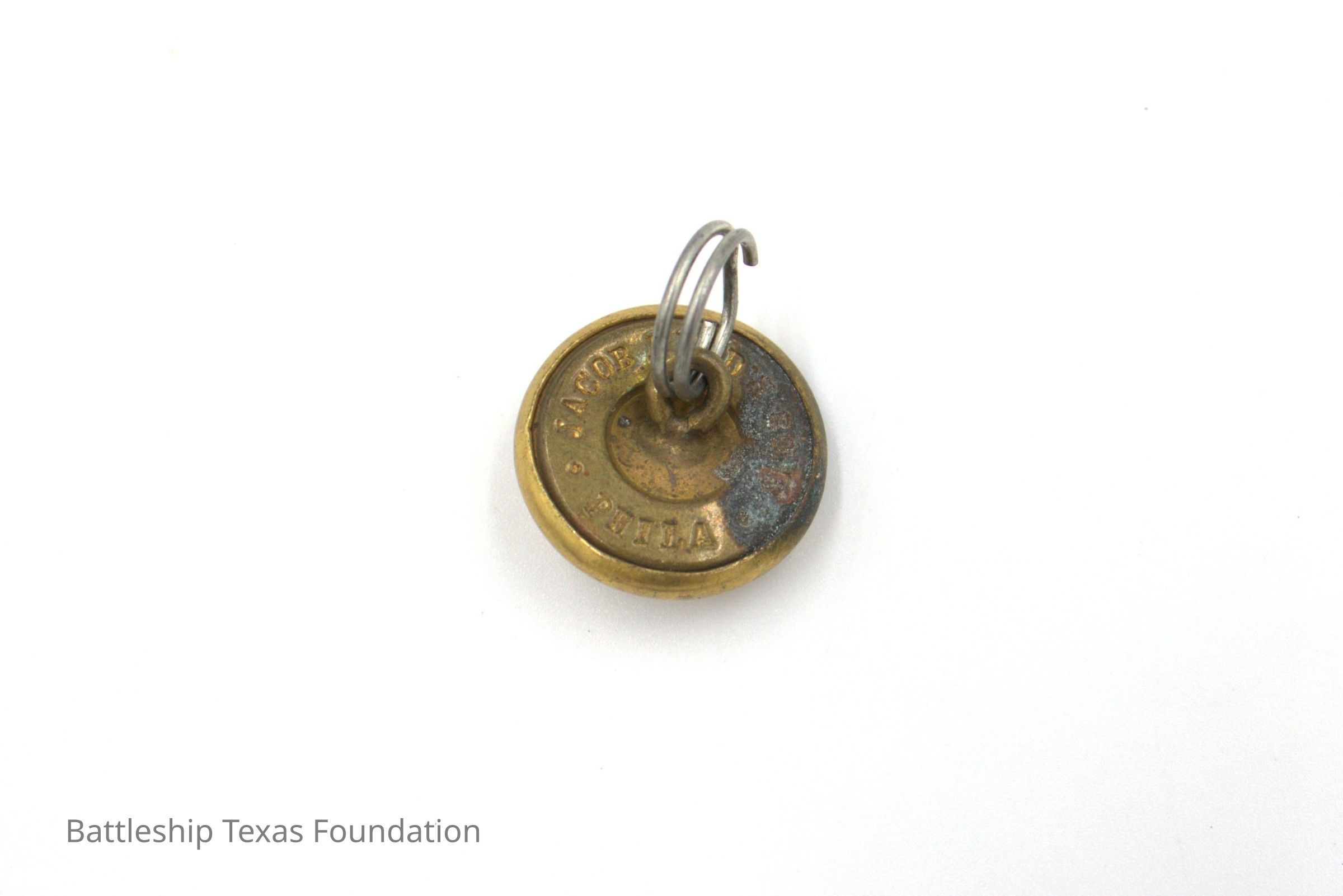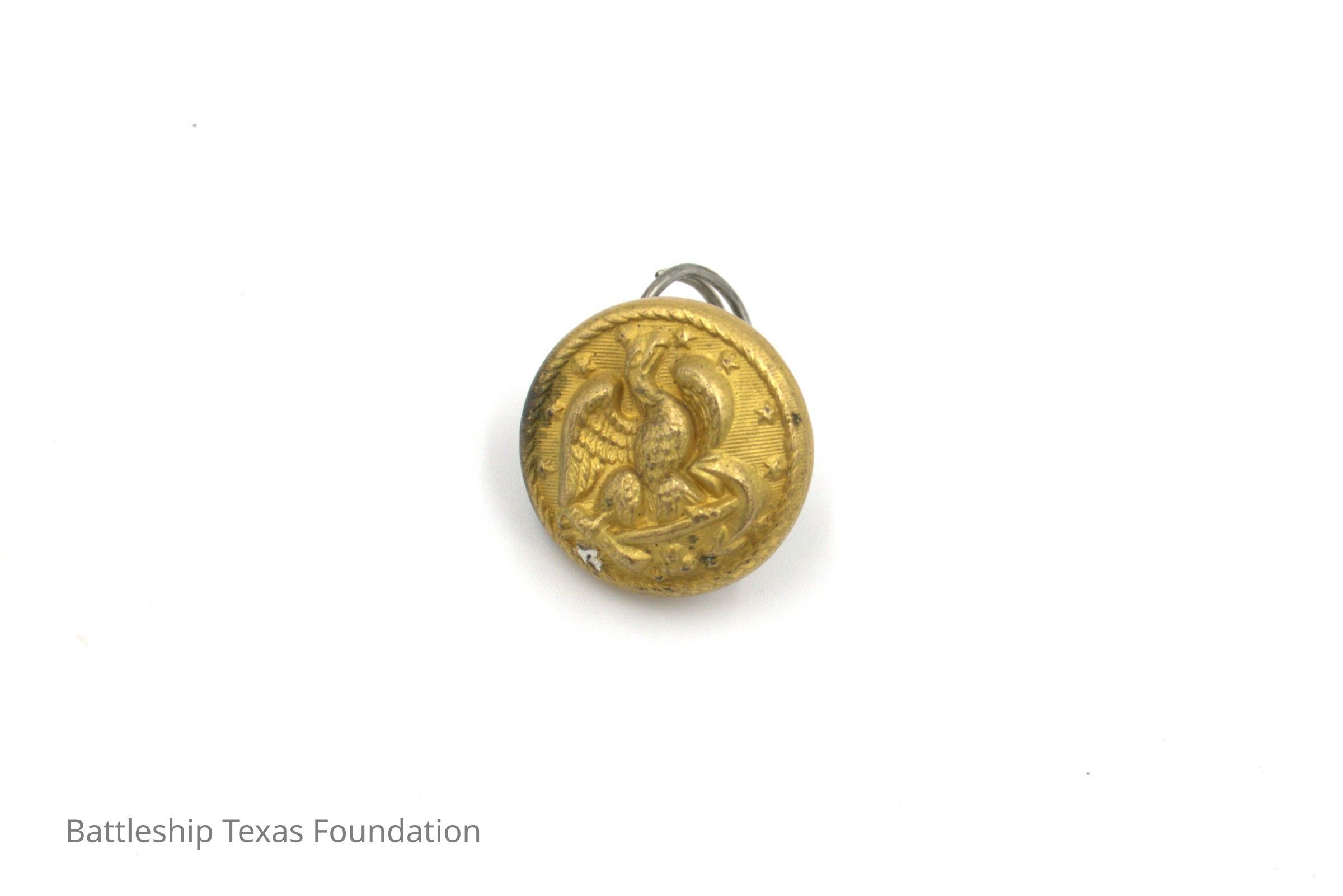 One of fifty-two individual gold buttons owned by Charles R. Pratt as spares for his USN overcoats. Button features an eagle perched on an anchor on the front. Button made by N.S. Meyers in New York.