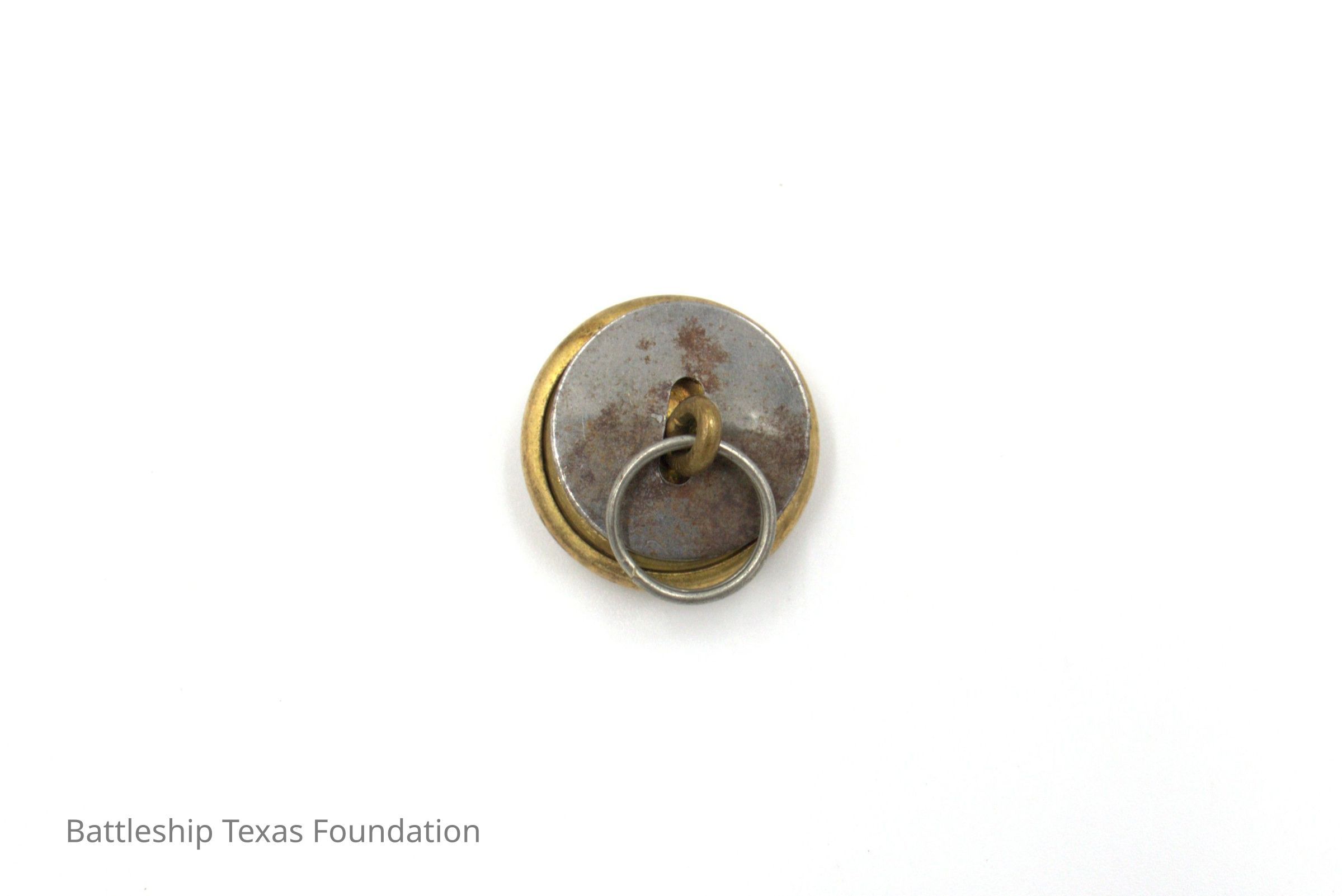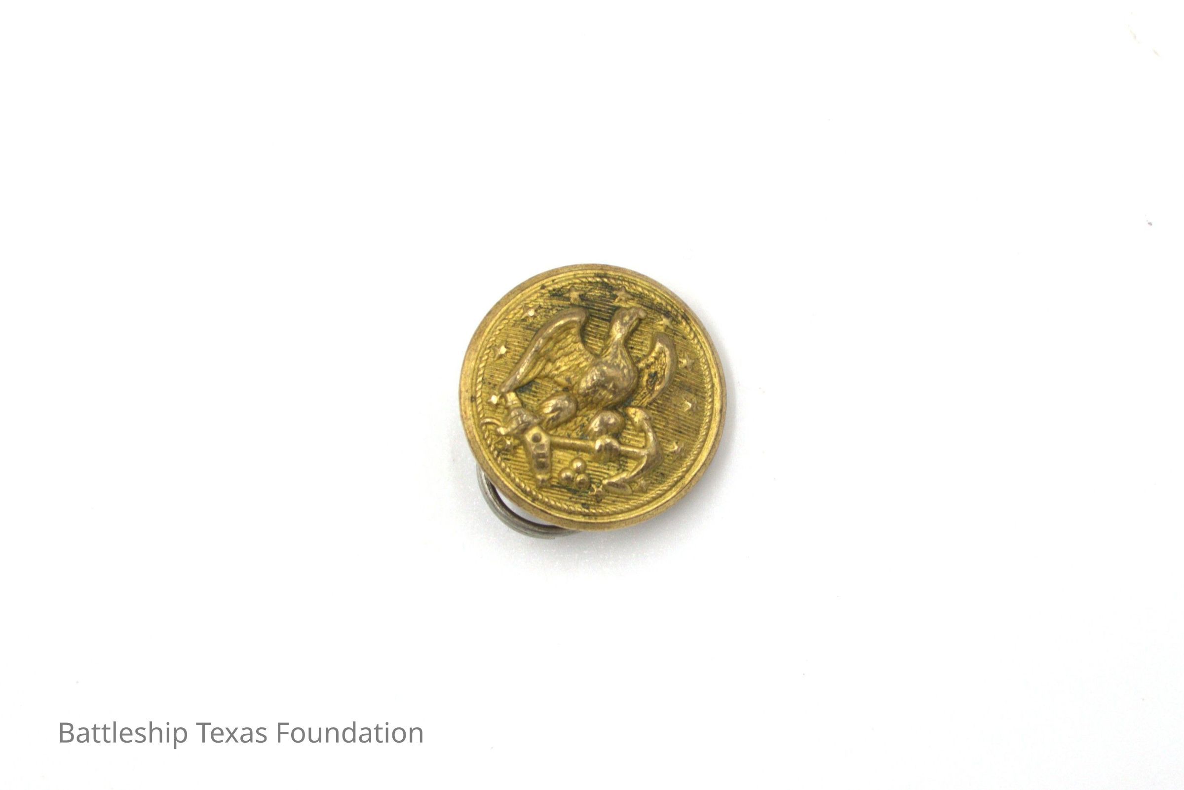 One of fifty-two individual gold buttons owned by Charles R. Pratt as spares for his USN overcoats. Button features an eagle perched on an anchor on the front. Button made by Jacob Reed's Sons.