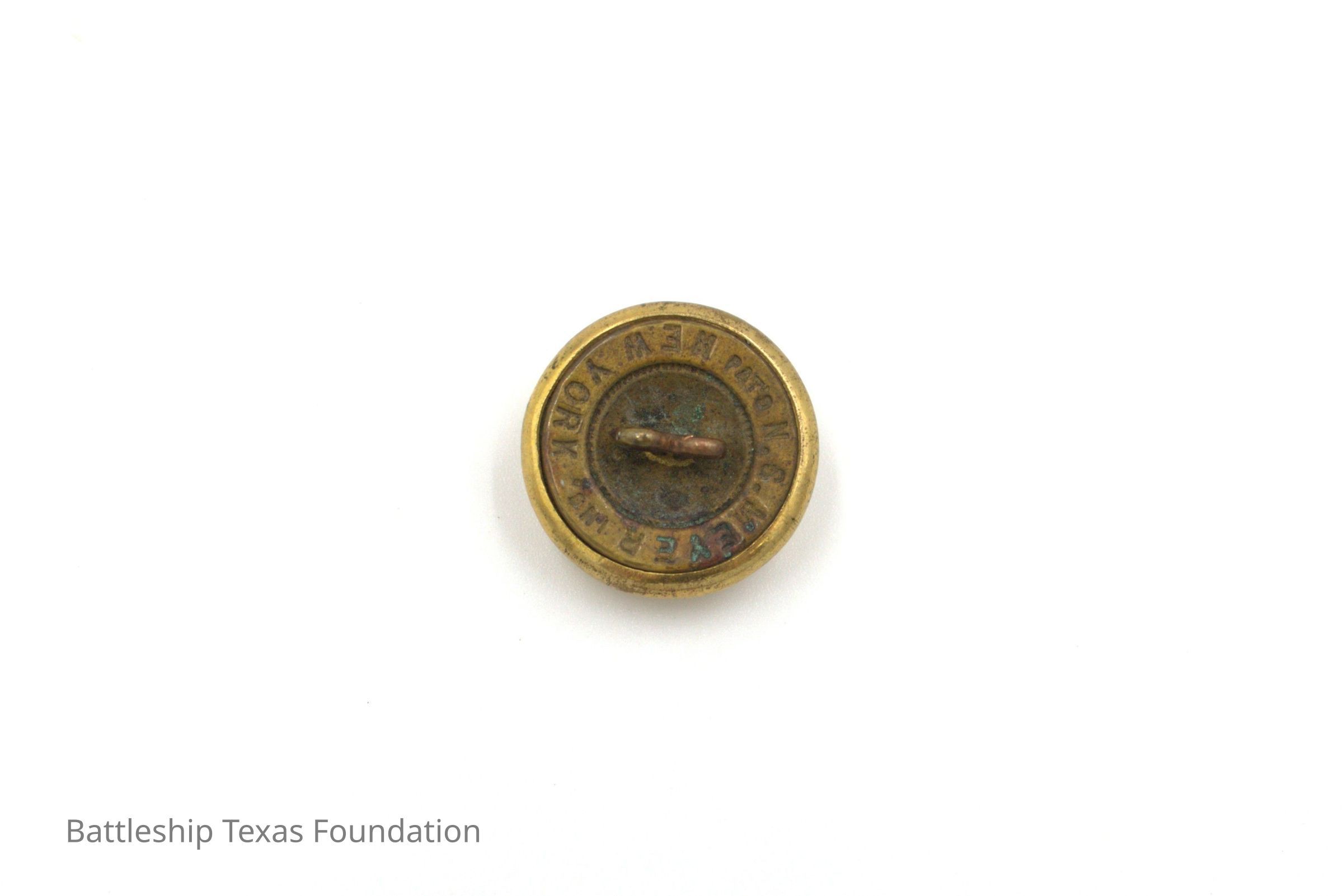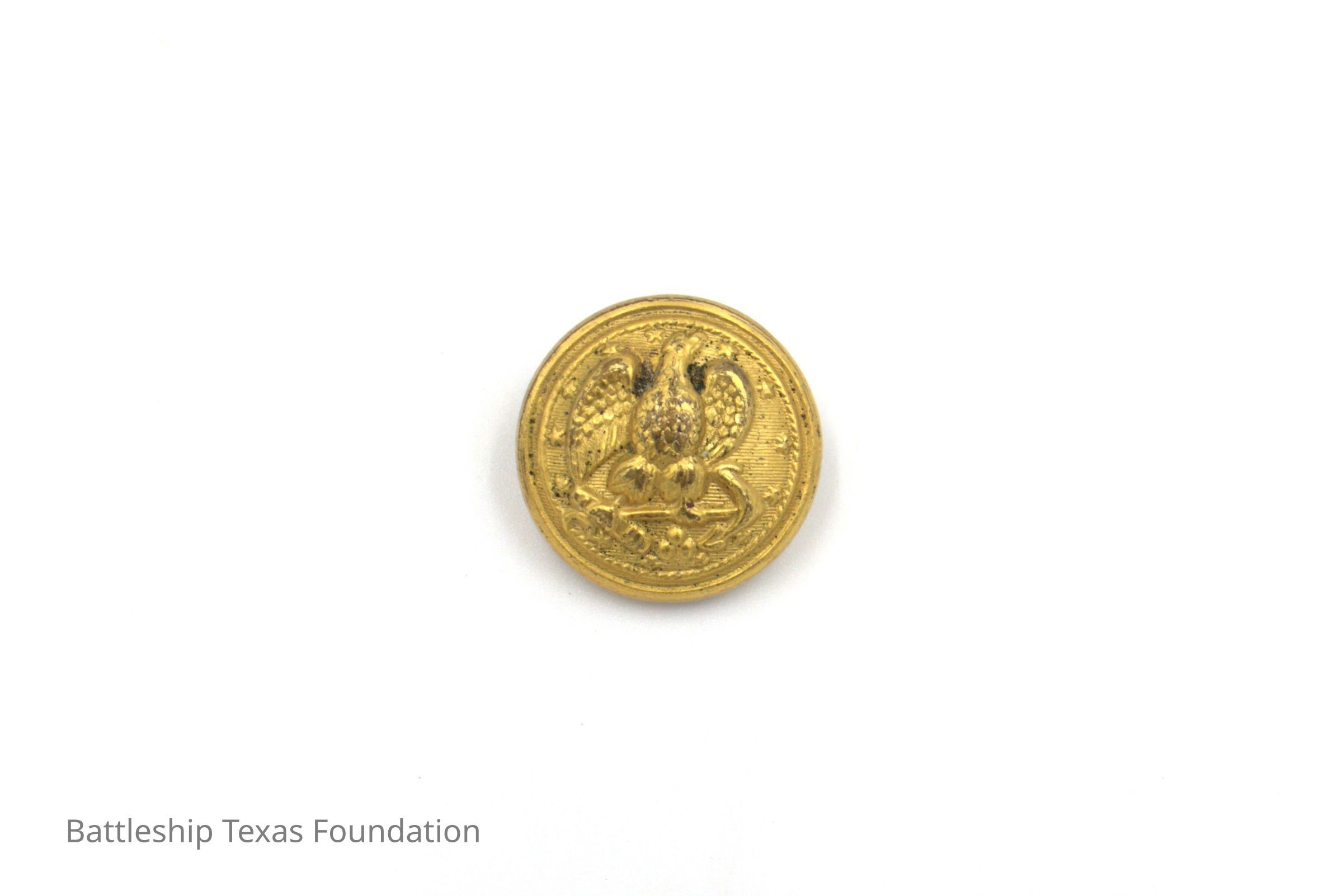 One of fifty-two individual gold buttons owned by Charles R. Pratt as spares for his USN overcoats. Button features an eagle perched on an anchor on the front. Button made by N.S. Meyers in New York.