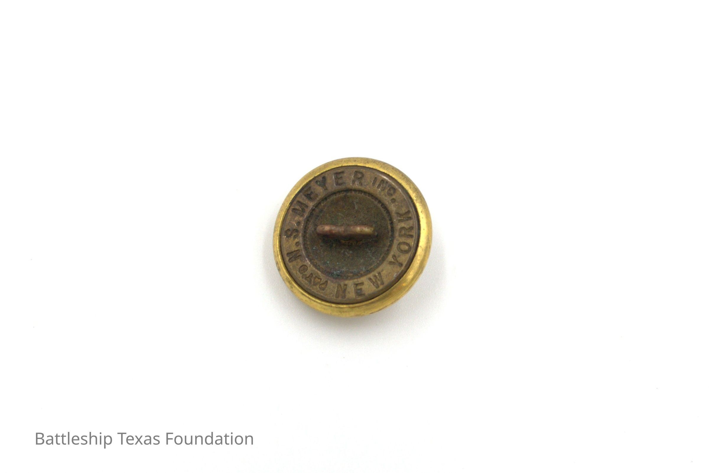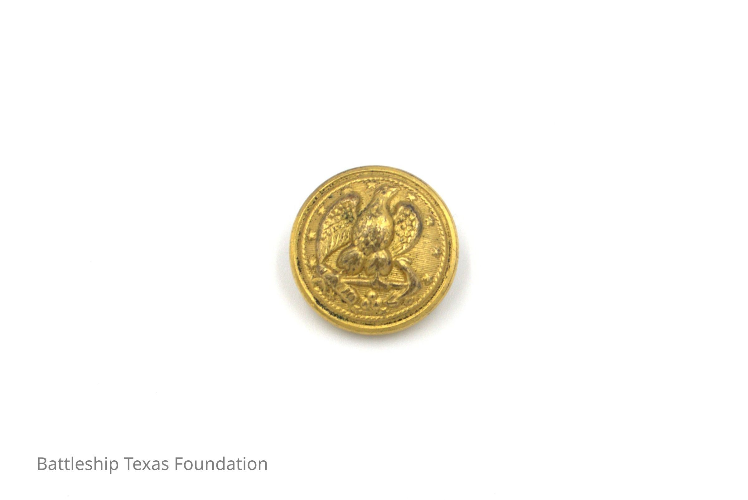 One of fifty-two individual gold buttons owned by Charles R. Pratt as spares for his USN overcoats. Button features an eagle perched on an anchor on the front. Button made by N.S. Meyers in New York.