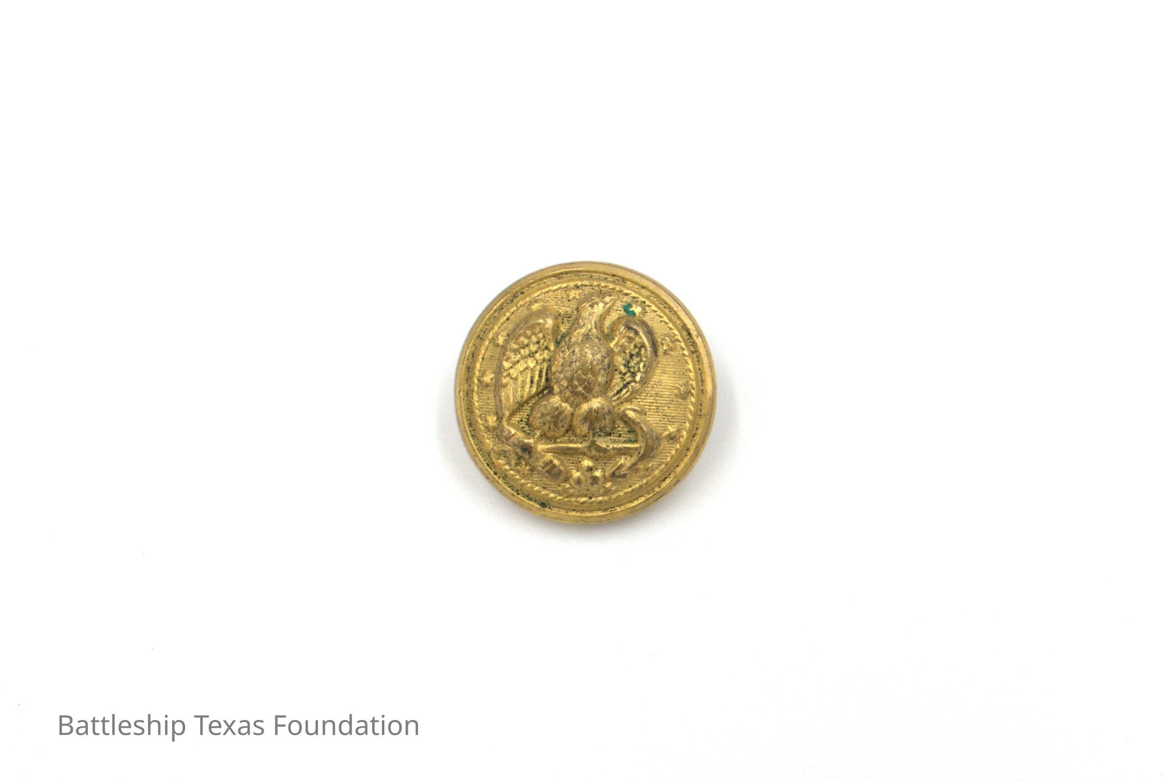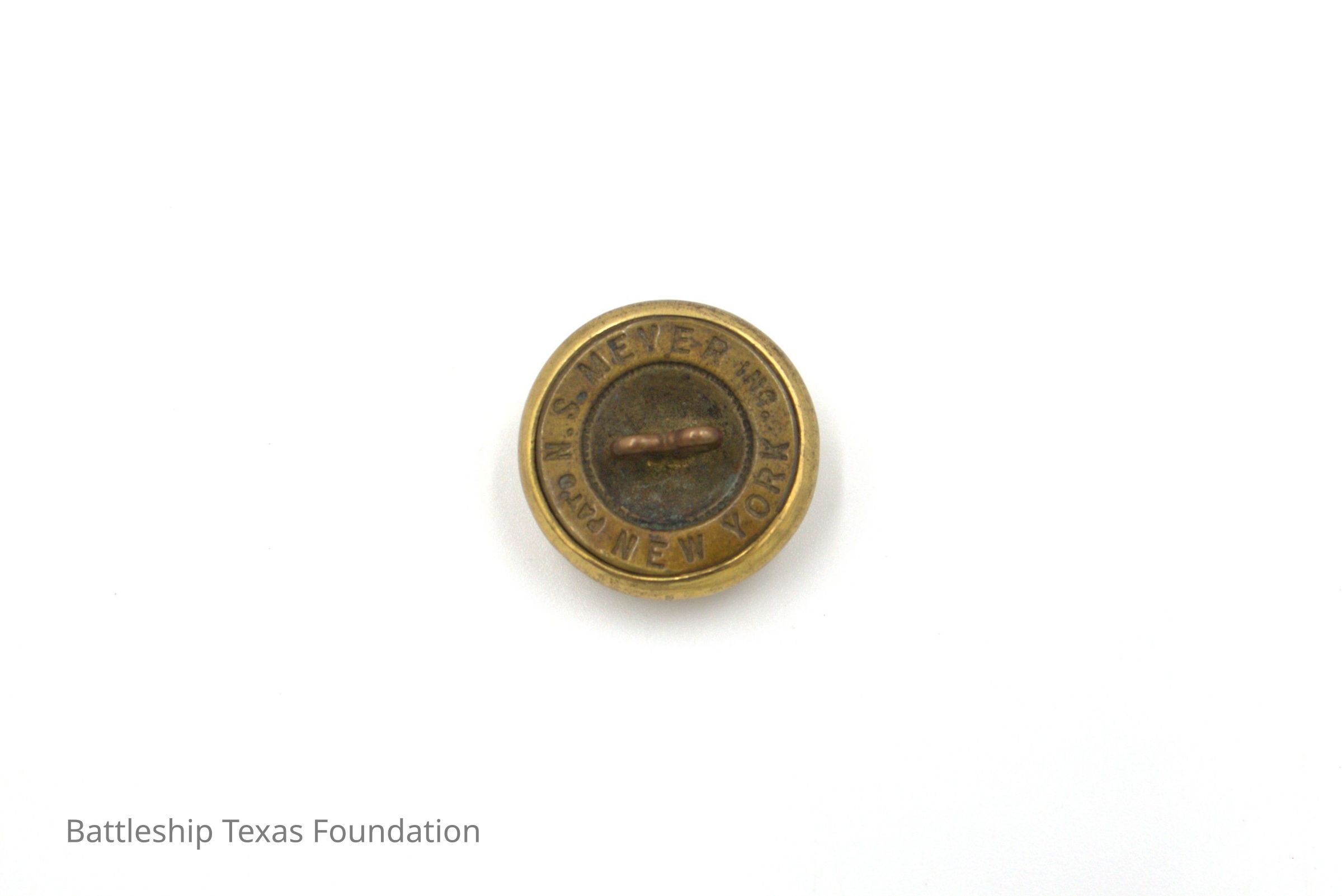 One of fifty-two individual gold buttons owned by Charles R. Pratt as spares for his USN overcoats. Button features an eagle perched on an anchor on the front. Button made by N.S. Meyers in New York.