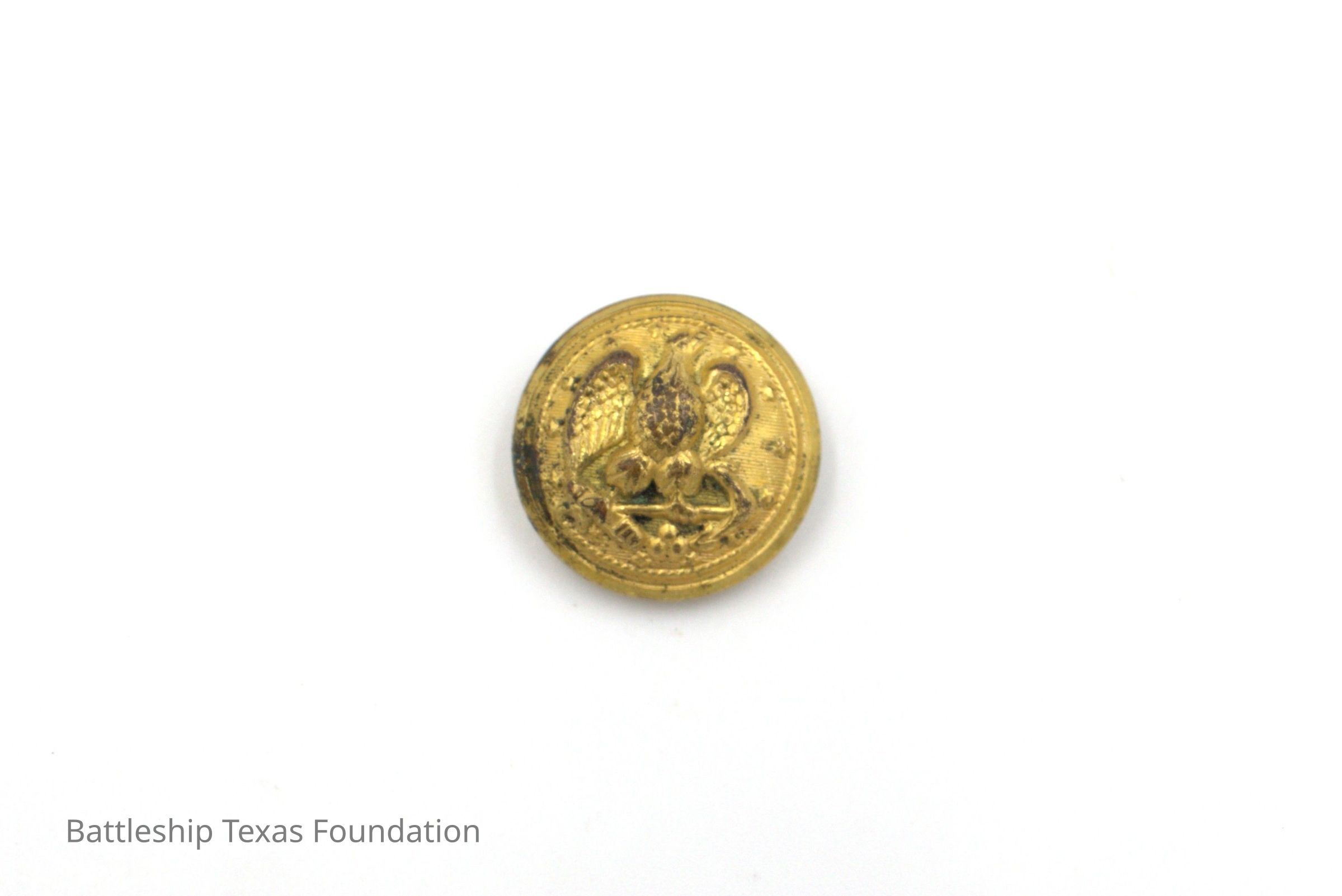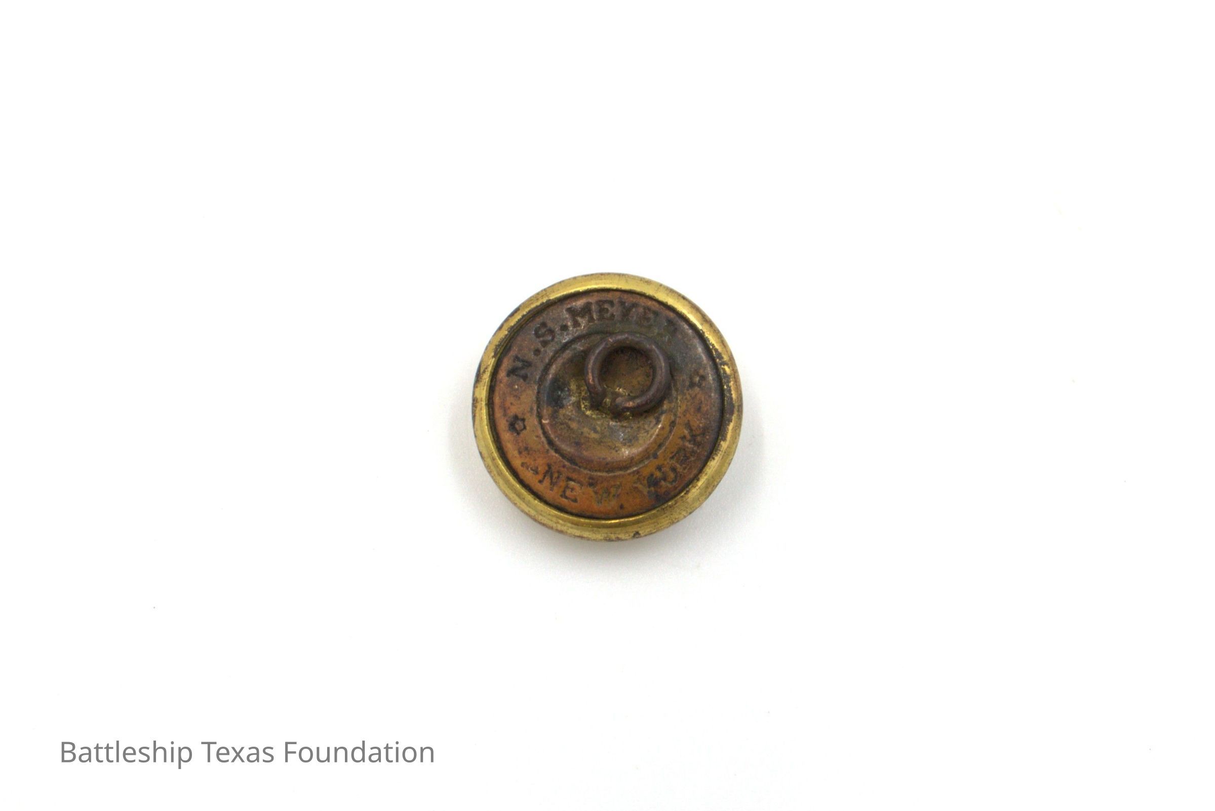 One of fifty-two individual gold buttons owned by Charles R. Pratt as spares for his USN overcoats. Button features an eagle perched on an anchor on the front. Button made by N.S. Meyers in New York.