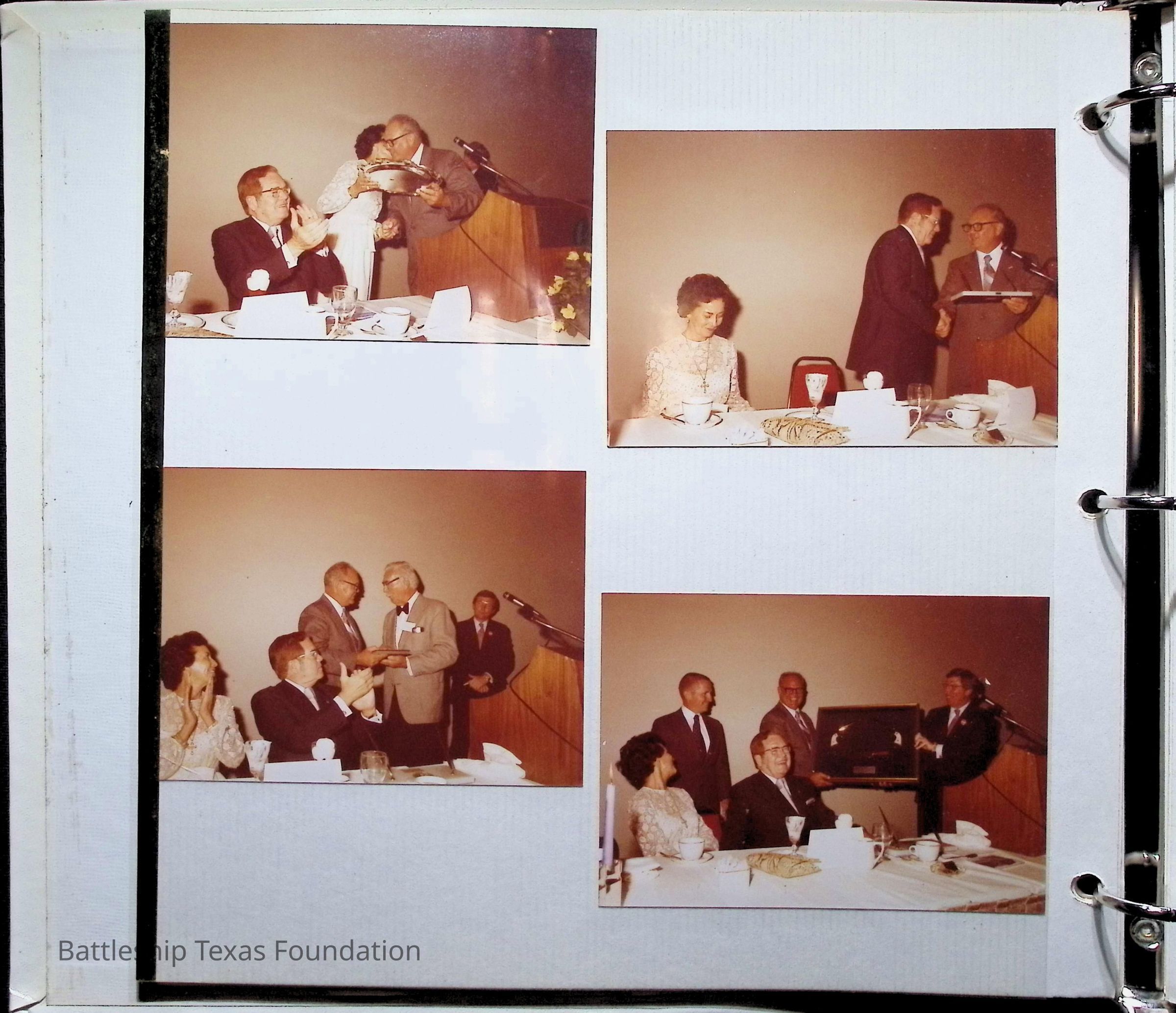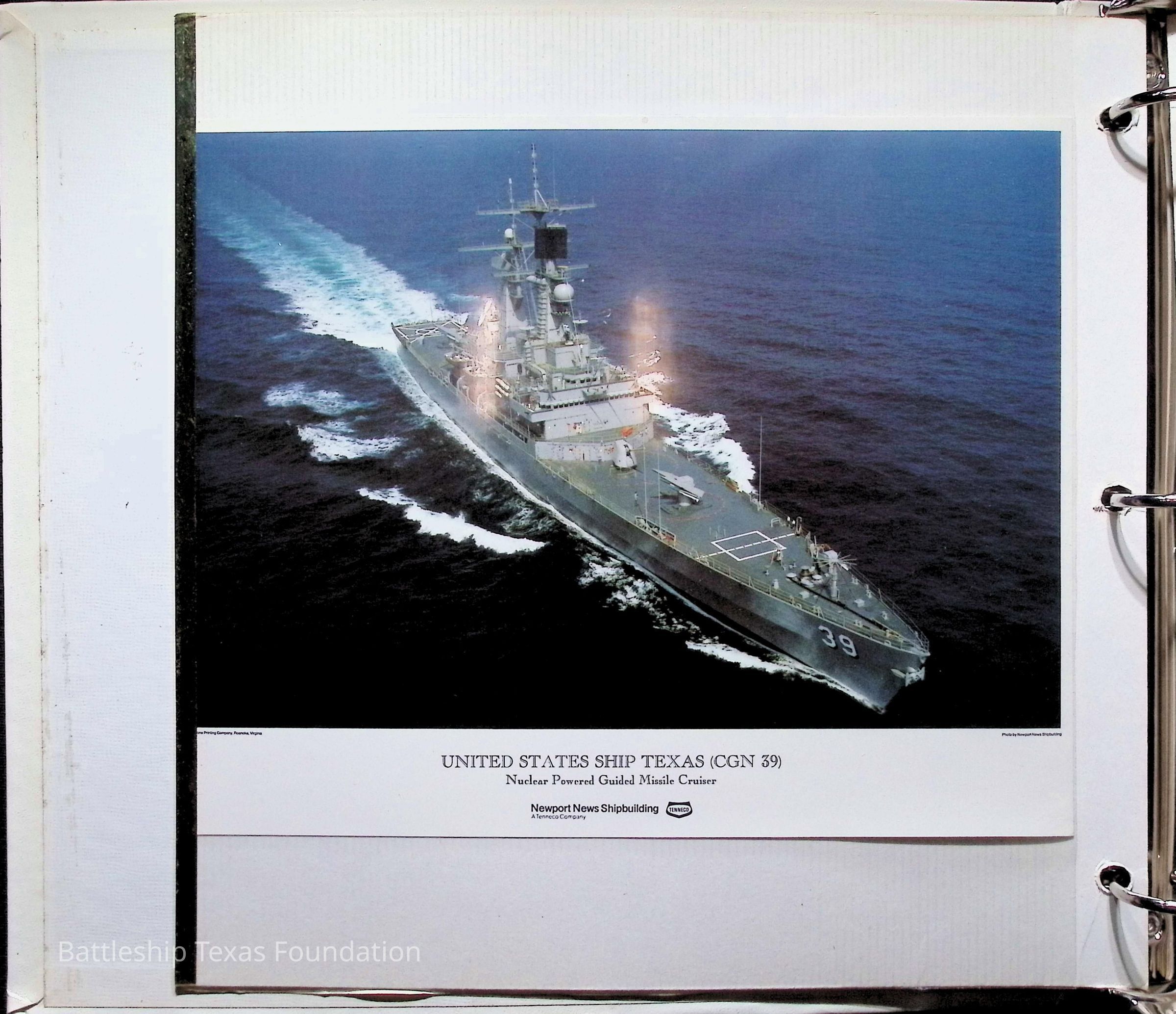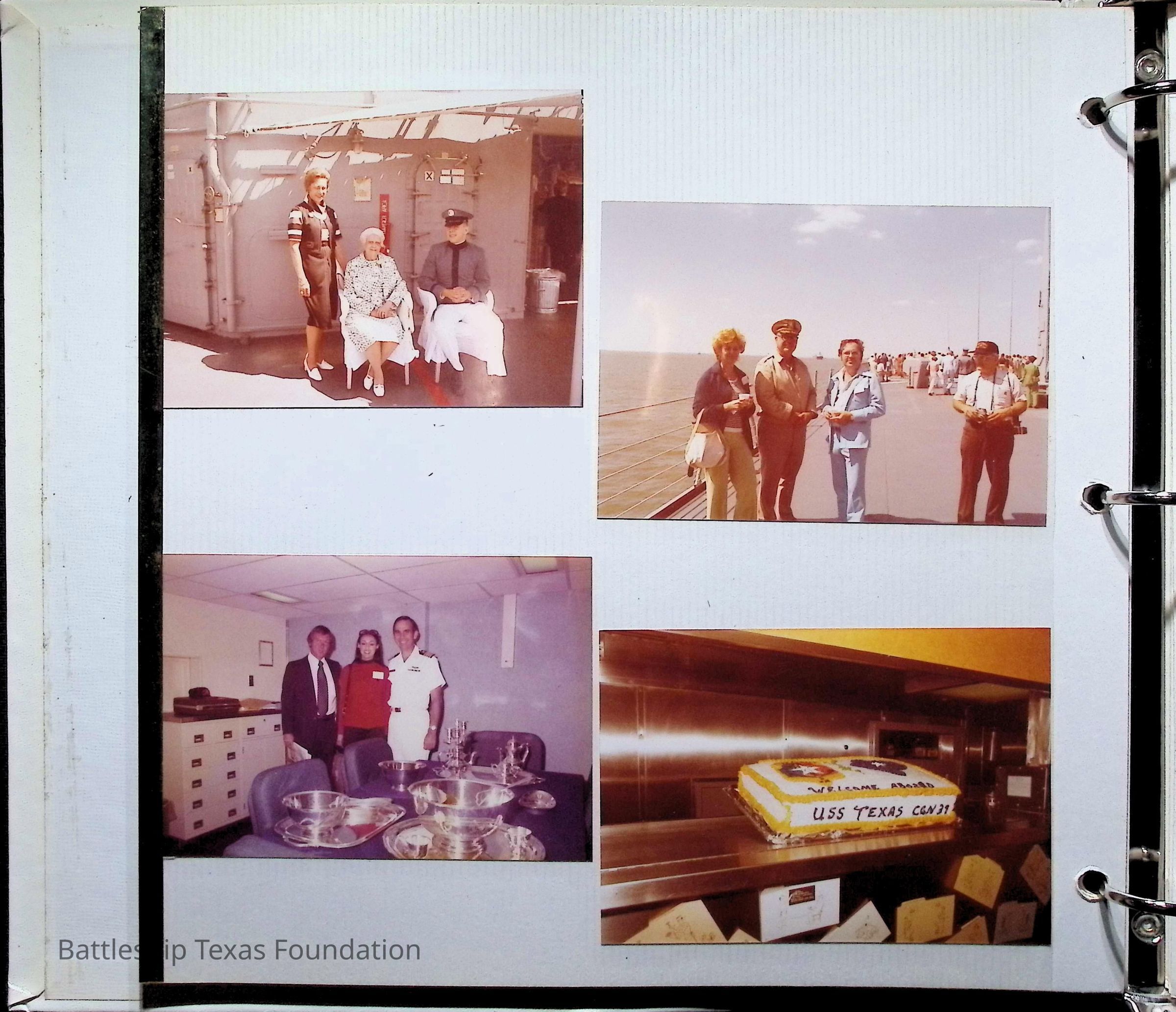 Photo album covering the commissioning of USS Texas (CGN-39). First page titled "A Remembrance of the Commissioning" "From your Texas friends" and presented to Captain Peter B. Fiedler. Only the first thirteen pages are filled, each with varying numbers of photos, totaling forty-three.Context