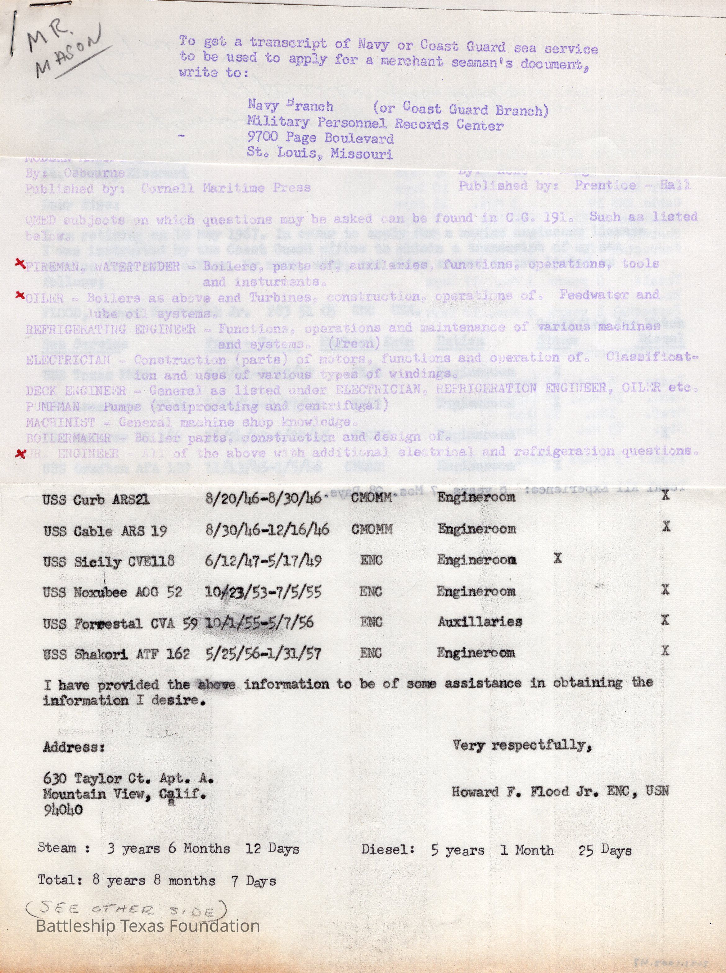 Packet of forms related to Howard Flood's USN sea service transcript. Form is meant to help sailors translate their military service to the civilian workforce. Flood's mentions the years of work in various engine rooms of US warships. USS Texas listed as steam engine experience.Context