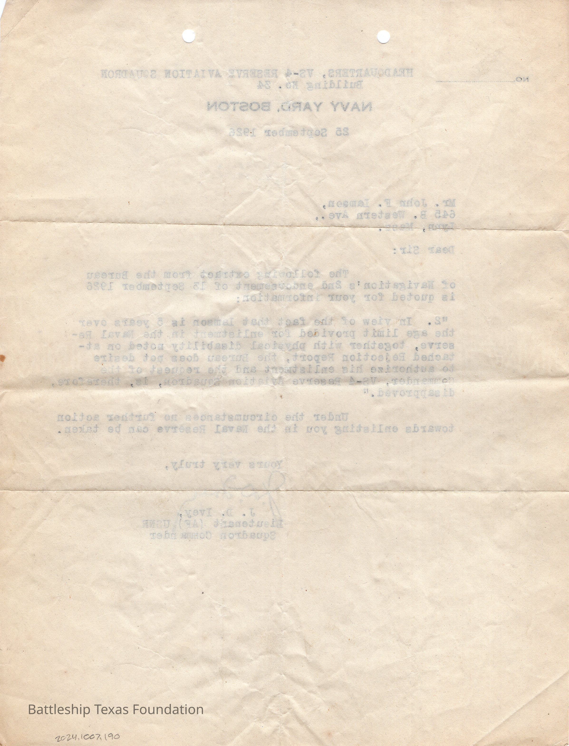 Letter to John Lamson disapproving of his further enlistment due to age and dissability. Dated @5 September 1926 from Navy Yard, Boston.Context