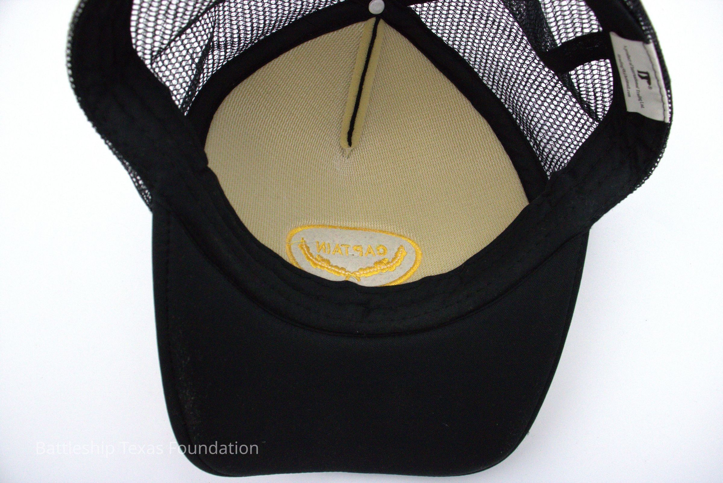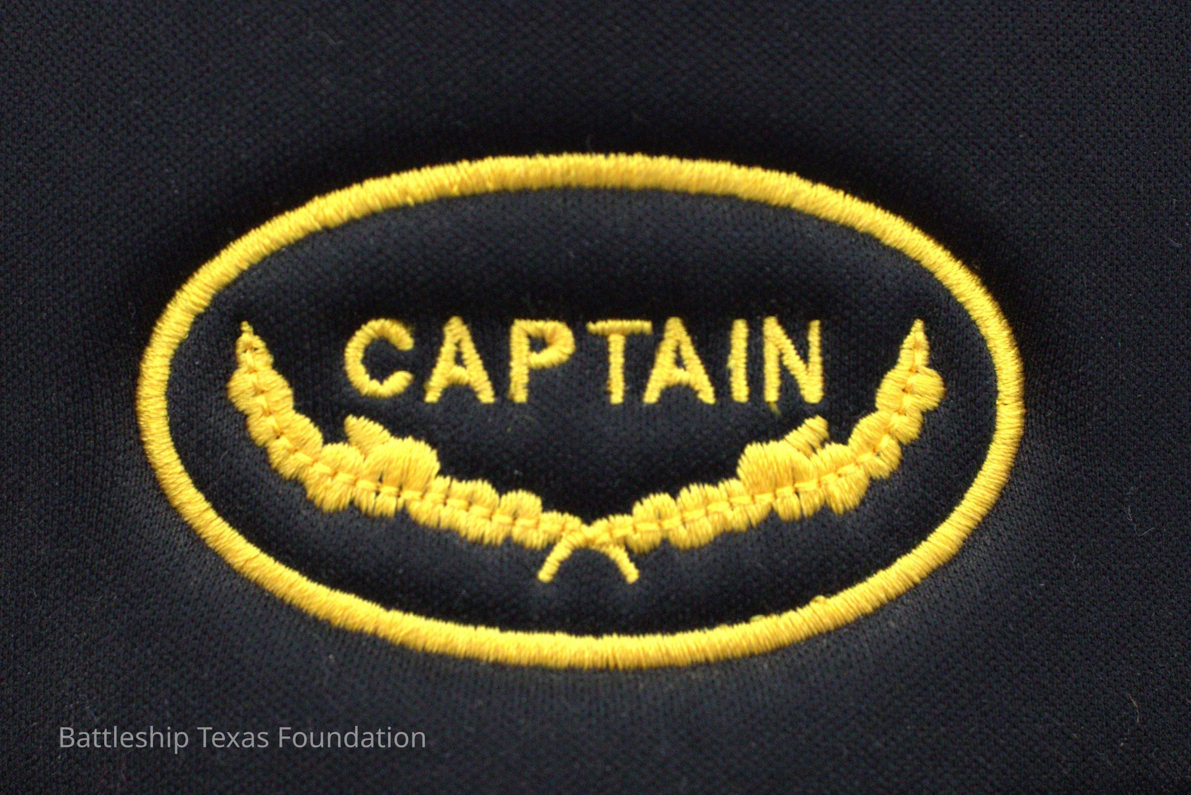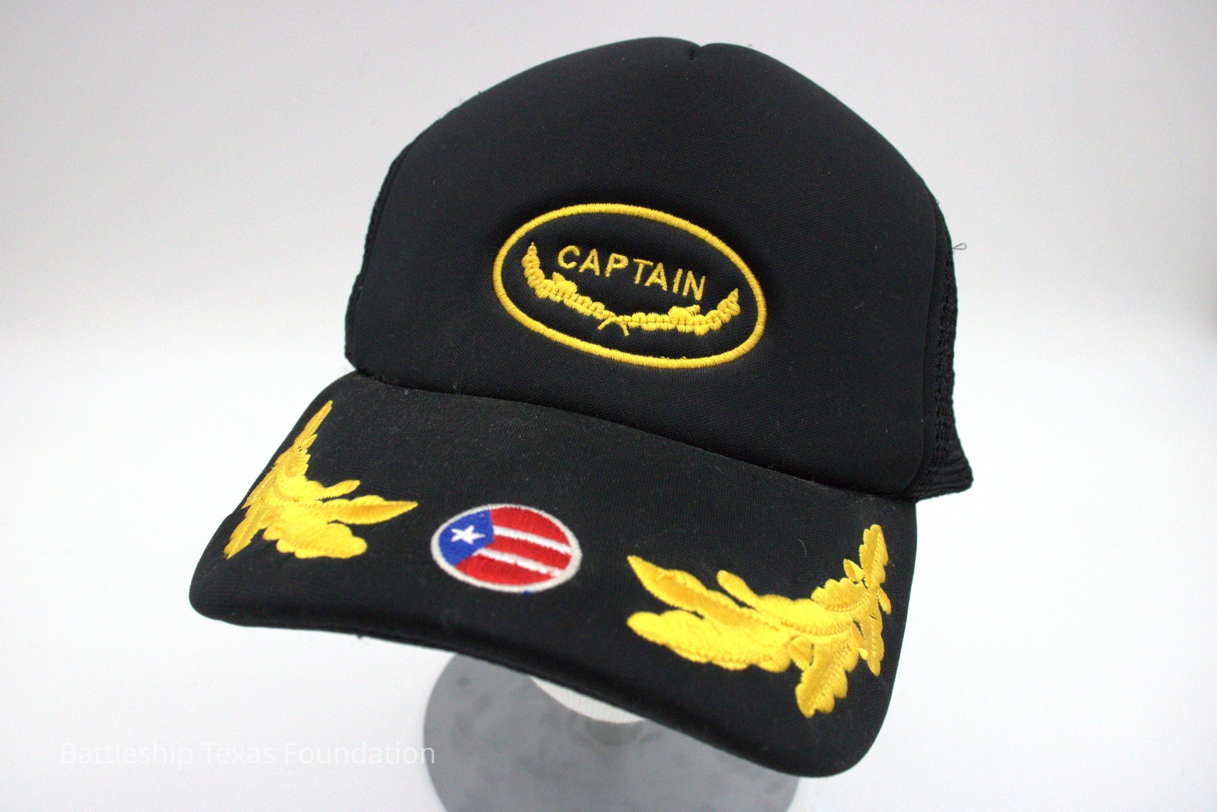 Black ball cap with "CAPTAIN" over golden wreaths in an oval. Bill has Edges in gold wreathing, and a white circle with Puerto Rican flag in the middle (likely meant to be US flag).Context