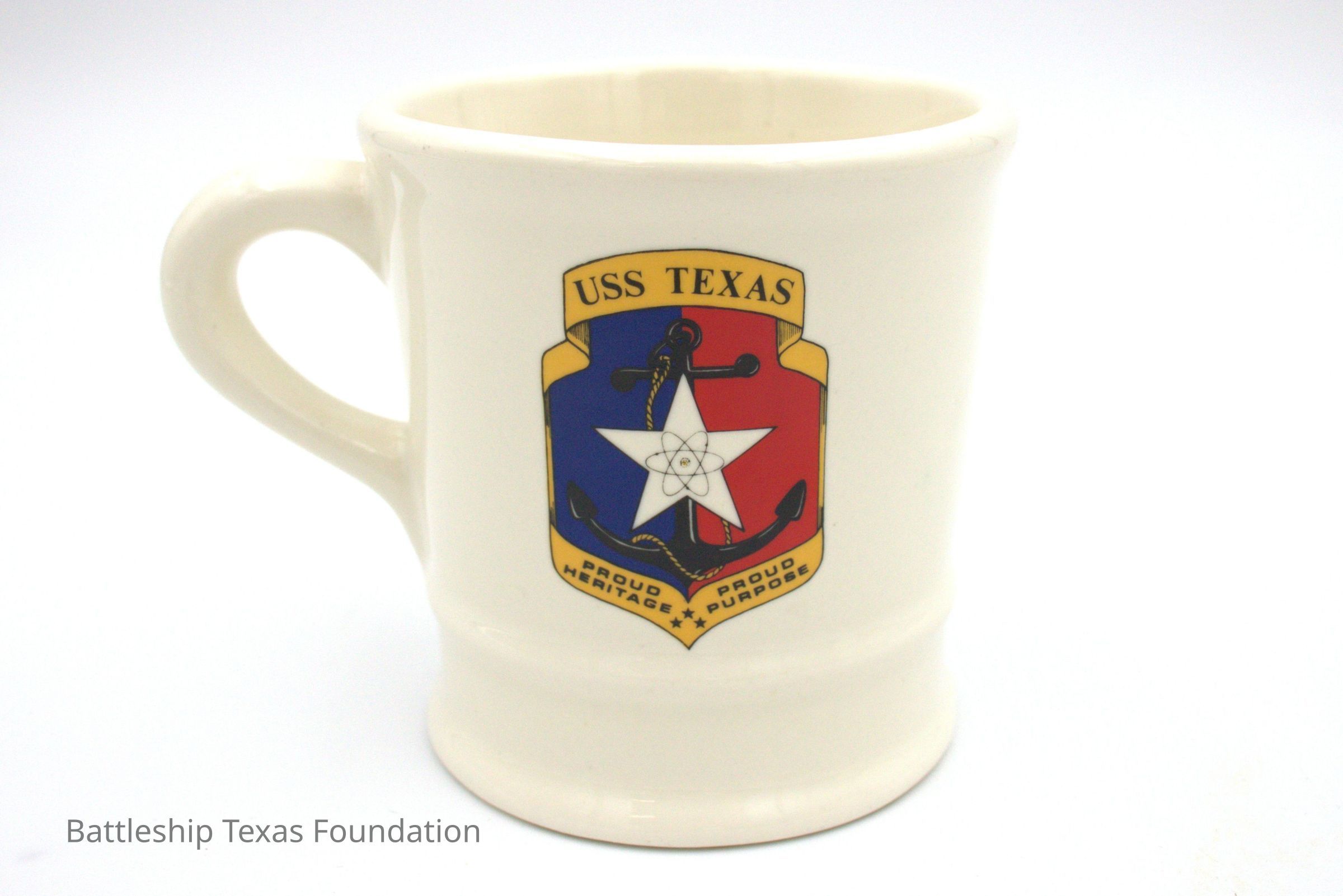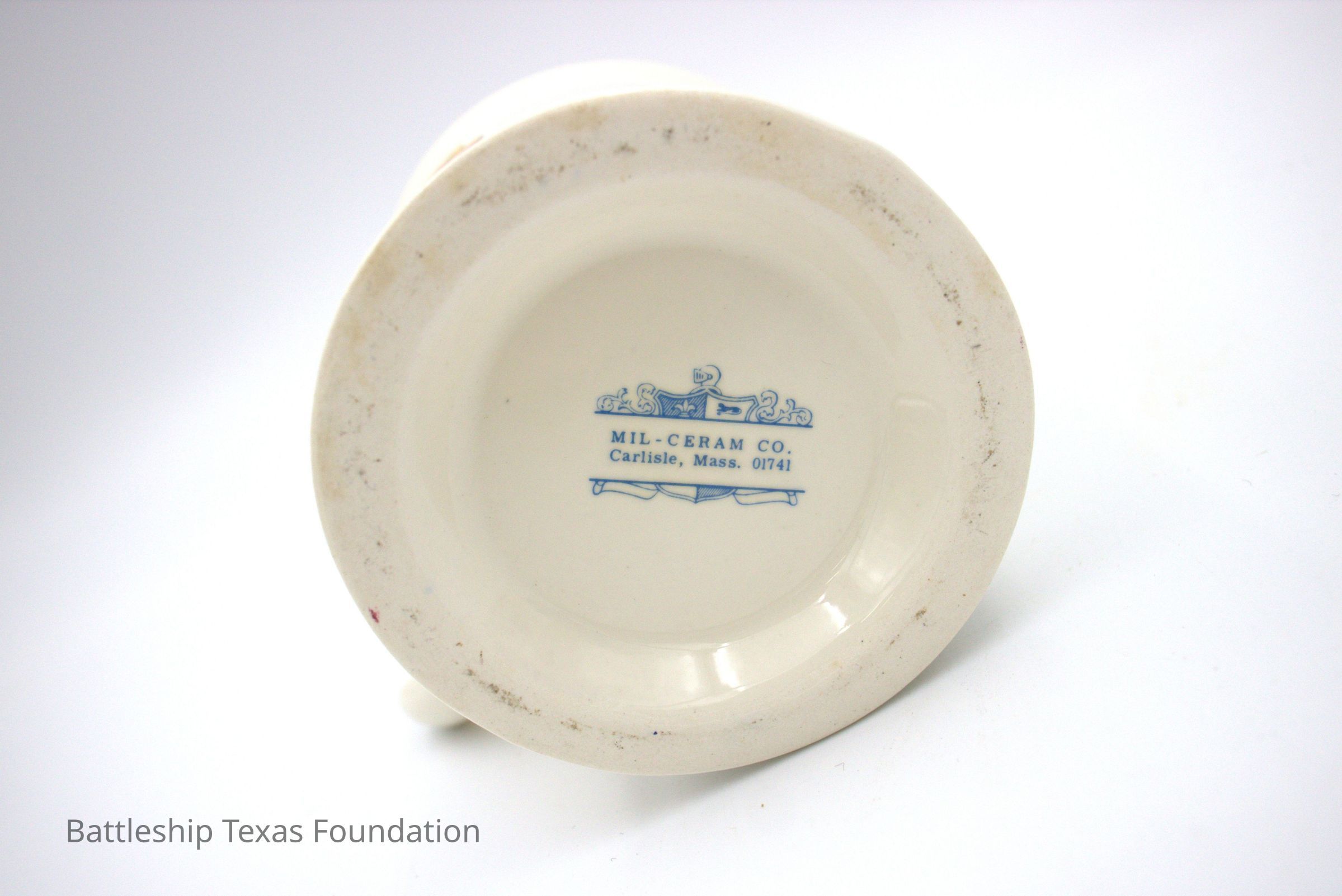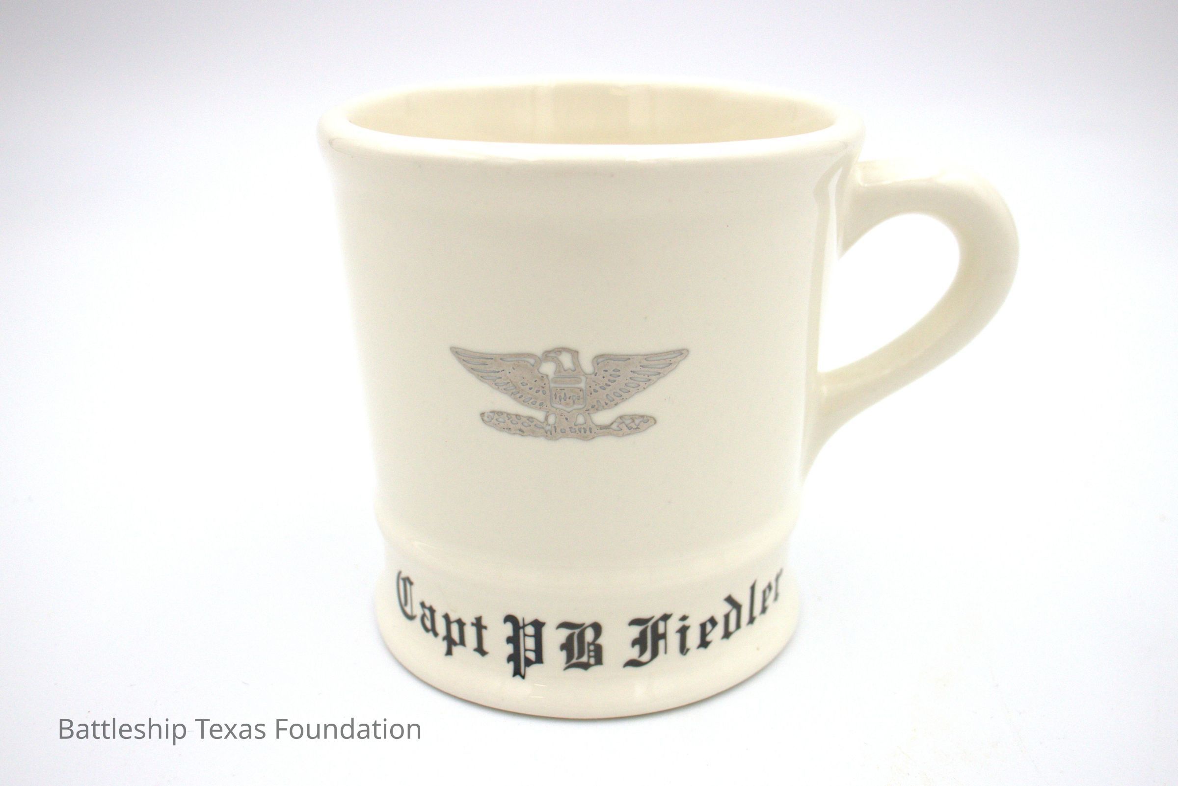 USS Texas mug used by Peter Fiedler. Back has captain eagle insignia, and identification "Capt PB Fiedler."Context