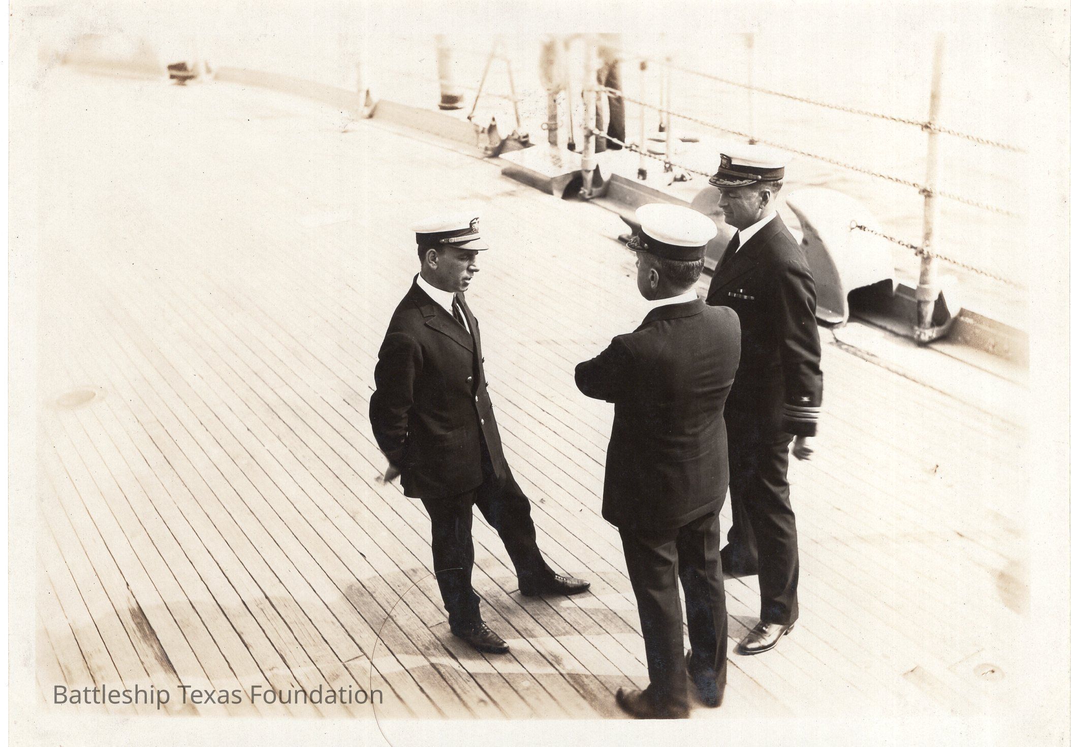 Features three men standing on main deck near edge of starboard side, including Captain Ivan C. Wettengel, captain of USS Texas from May 22, 1924 through September 28, 1925.Context