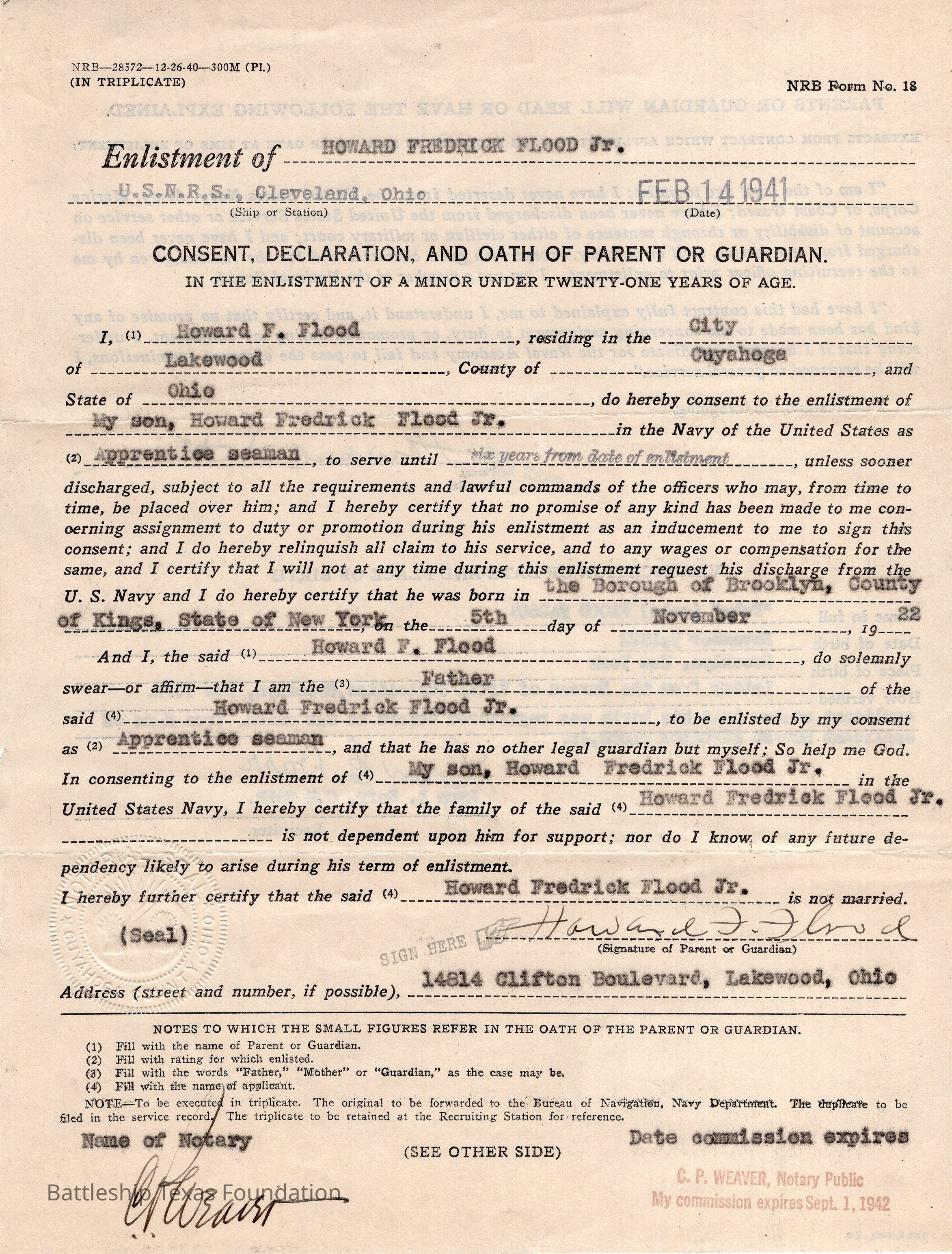 Howard Flood Jr's parents' consent form allowing their son to enlist in the US Navy Reserves.Context