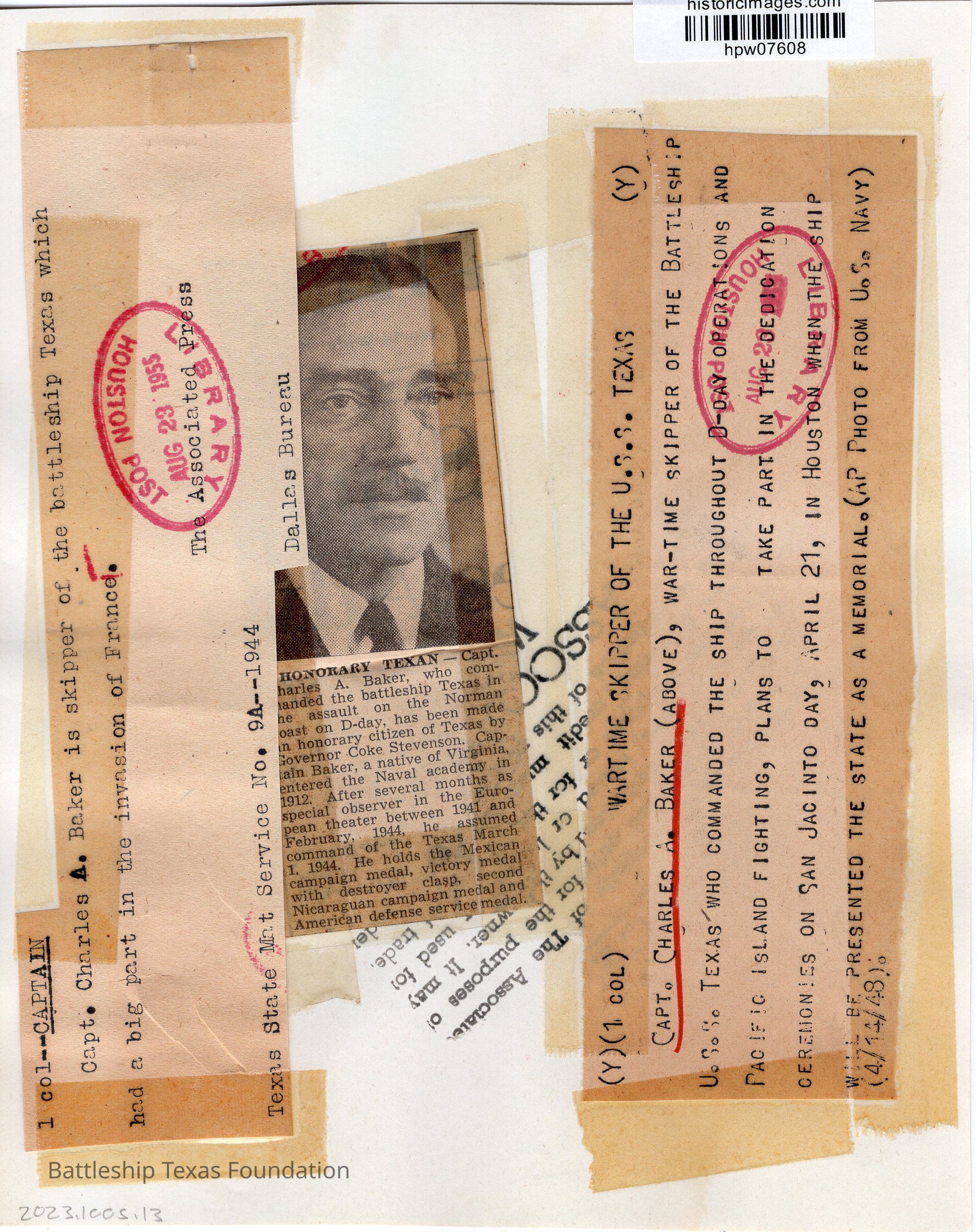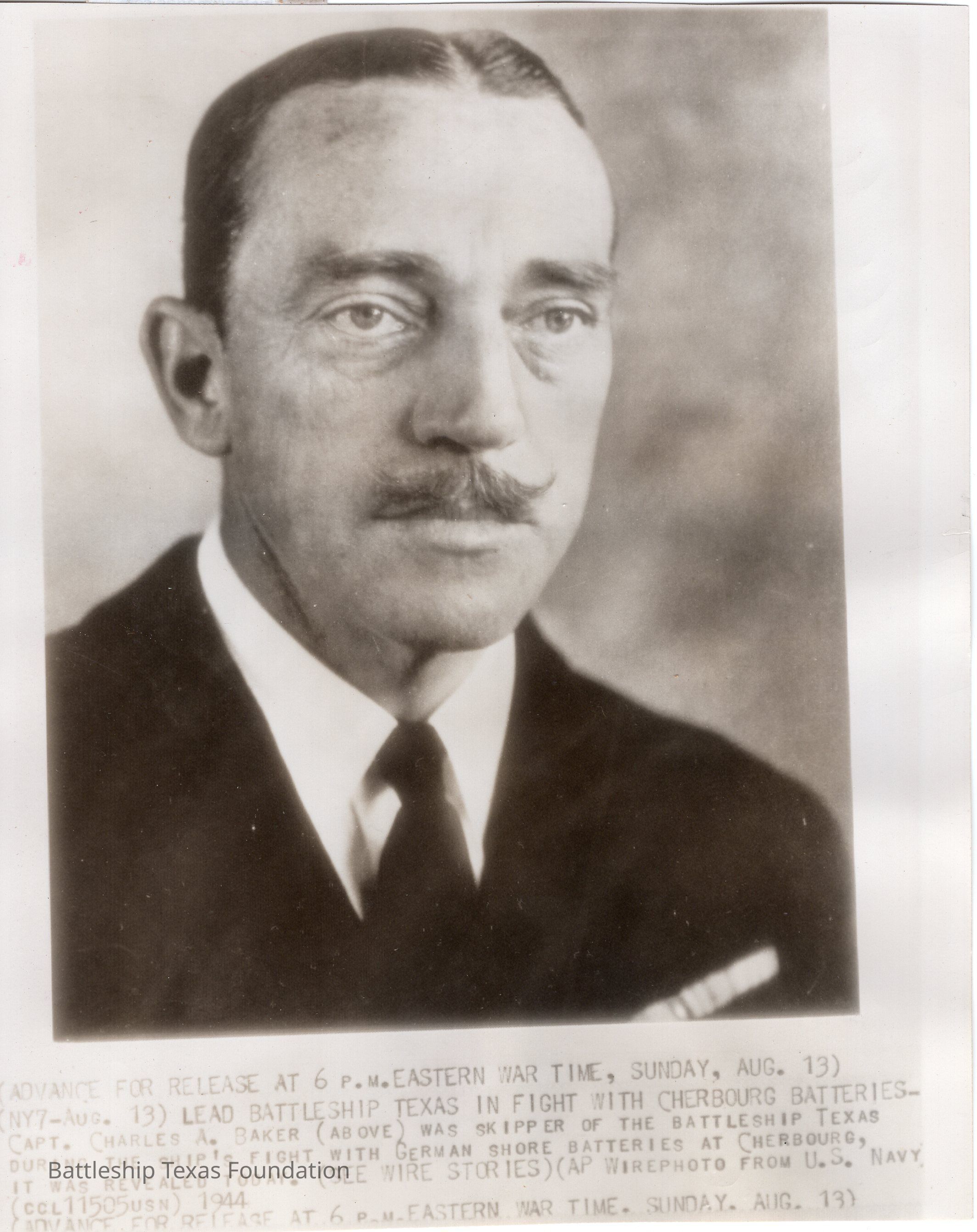 Captain Charles Baker in black and white. Caption starts "Advance for release at 6 P.M. Eastern War Time..." Back has several clippings from newspapers, including a smaller version of the front picture. Photograph used in August 23, 1955 newspaper.Context