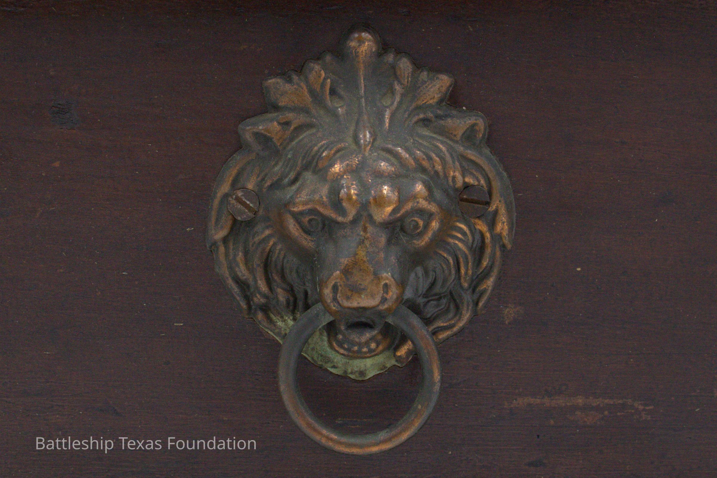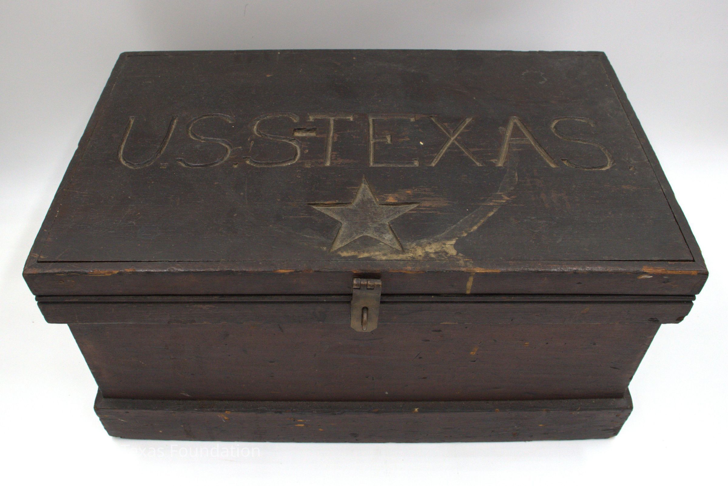 Chest with carved "U.S.S-TEXAS" and a star. Lion handles on sides.Context