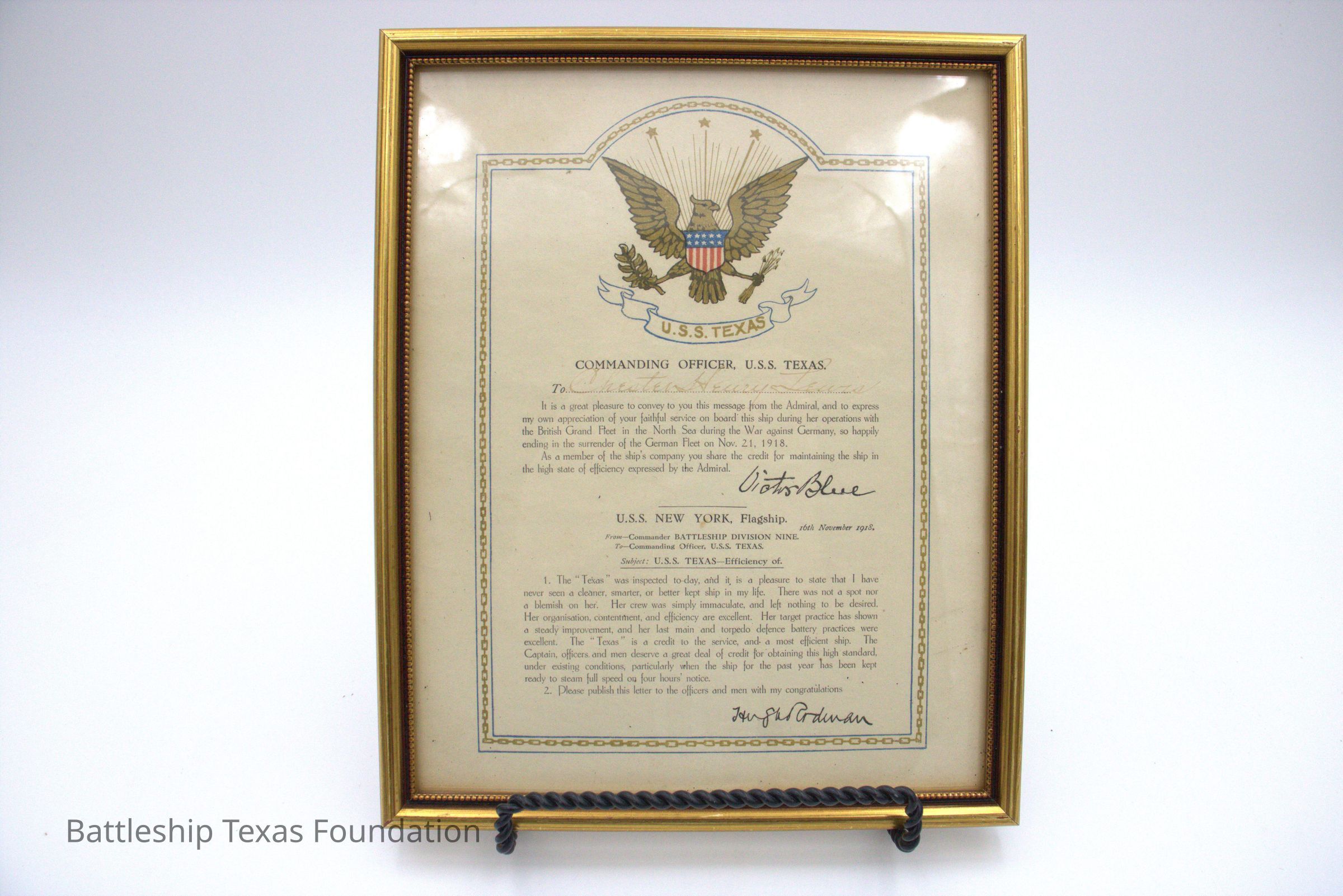 This letter was given to every officer and crew member of Battleship Texas at the conclusion of overseas service.Collection