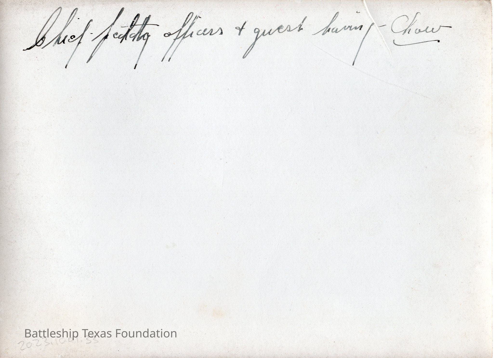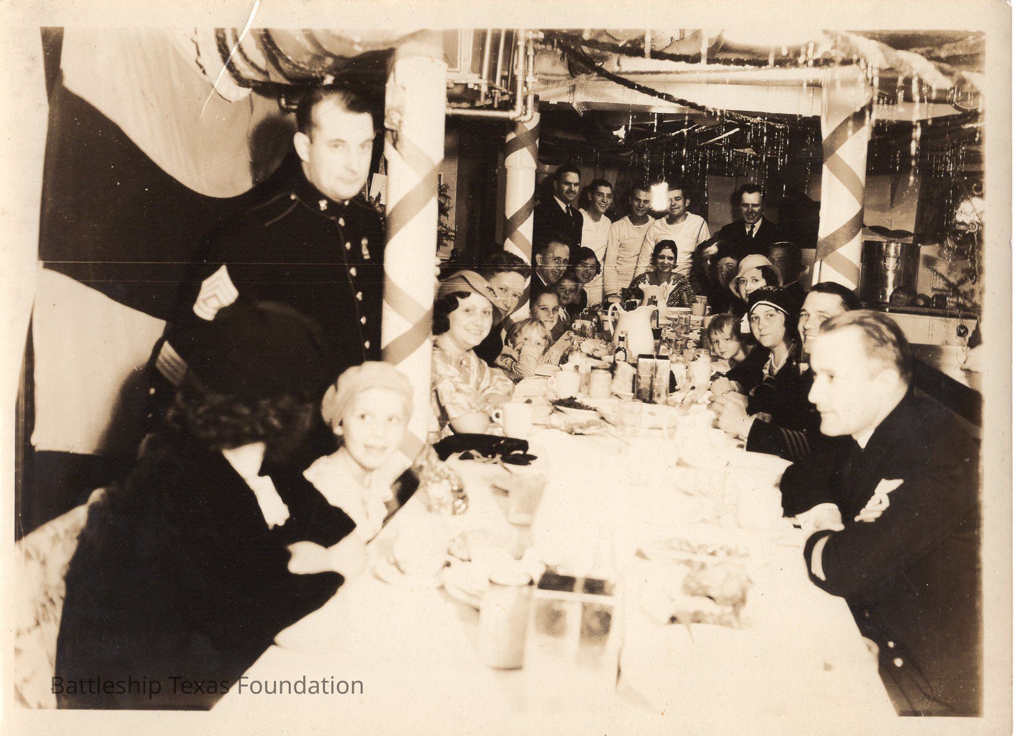 officers and civilians eating around table. Support posts decorated with ribbons. Five men standing in background. Back says "chief petty officers & guest having - chow"