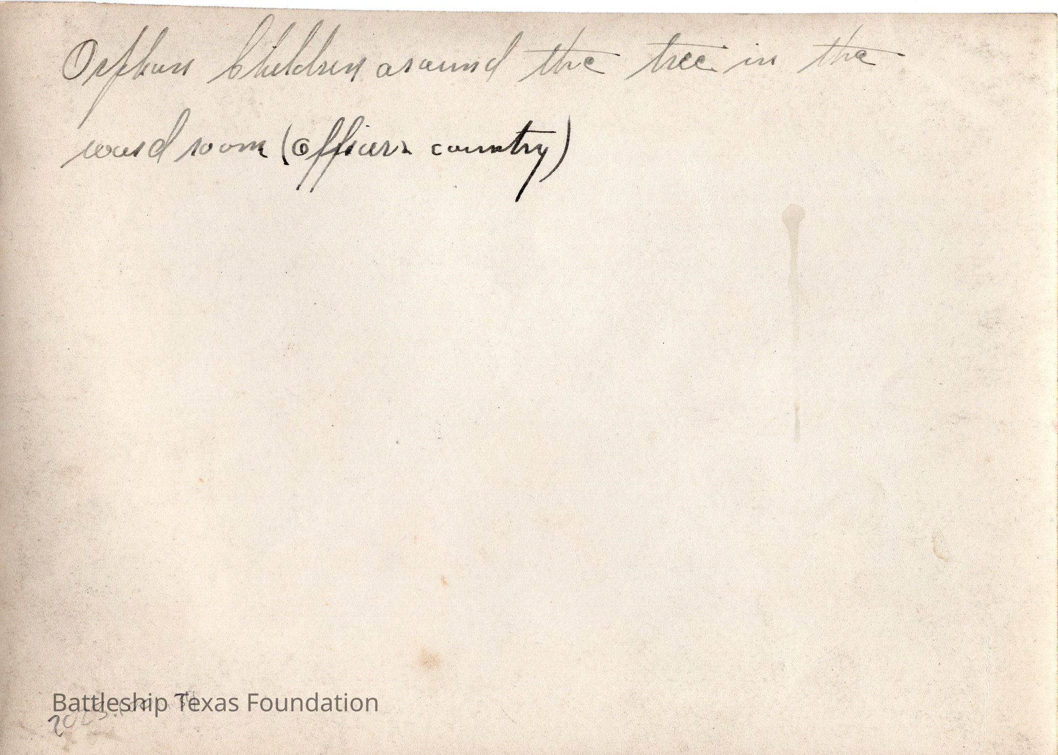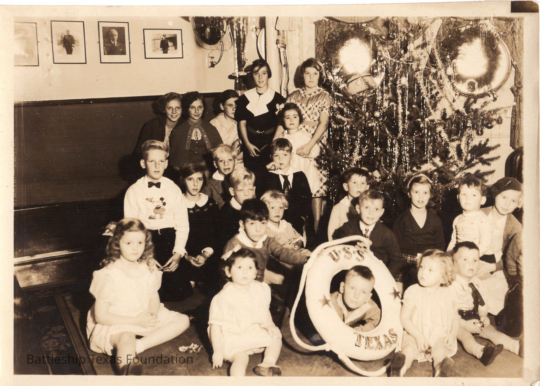 Large group of children with Christmas tree to the right of the group. Boy sticking head through USS TEXAS life saver. Back says "Orphans [gathering] around the tree in the ward room (officers country)"