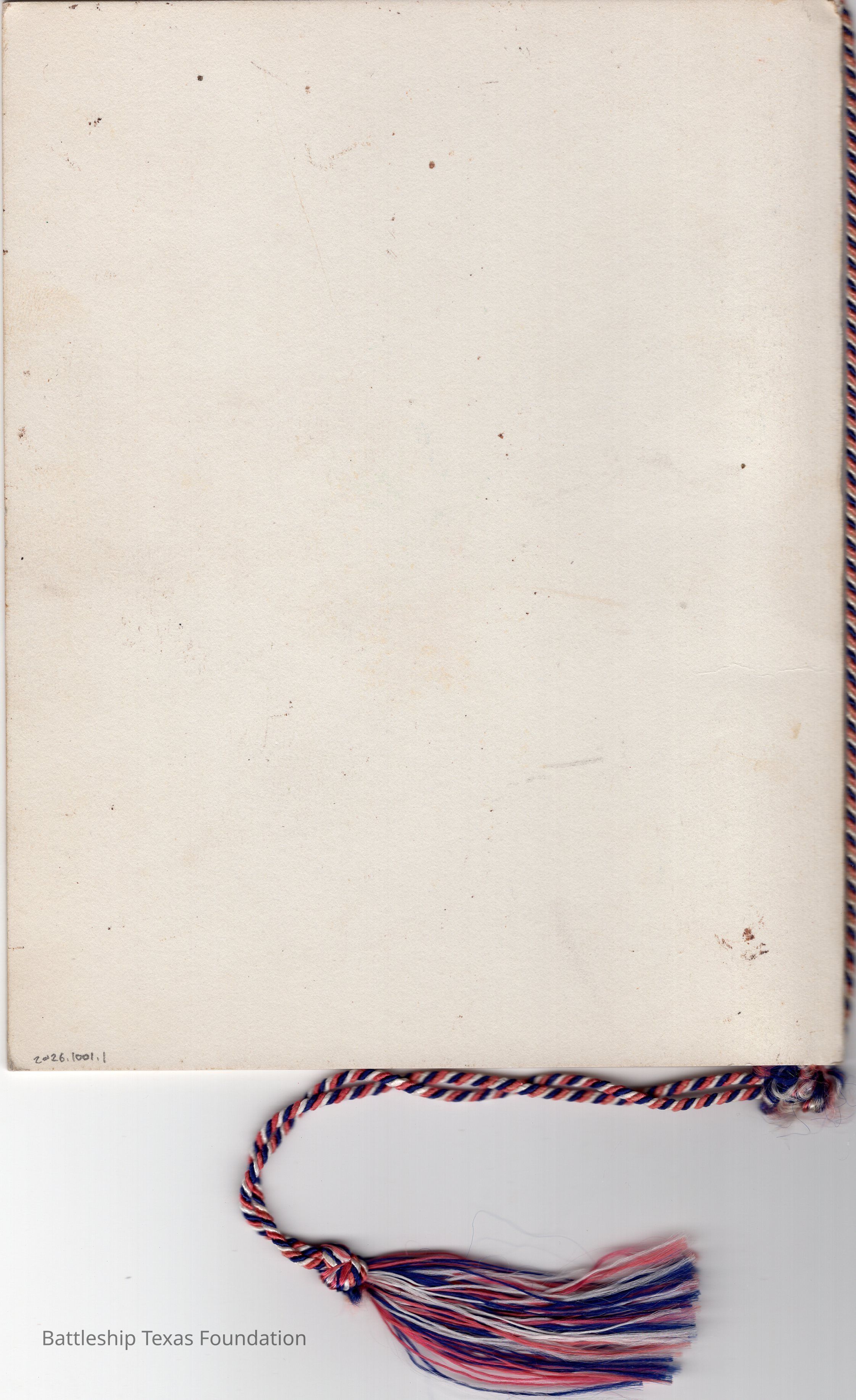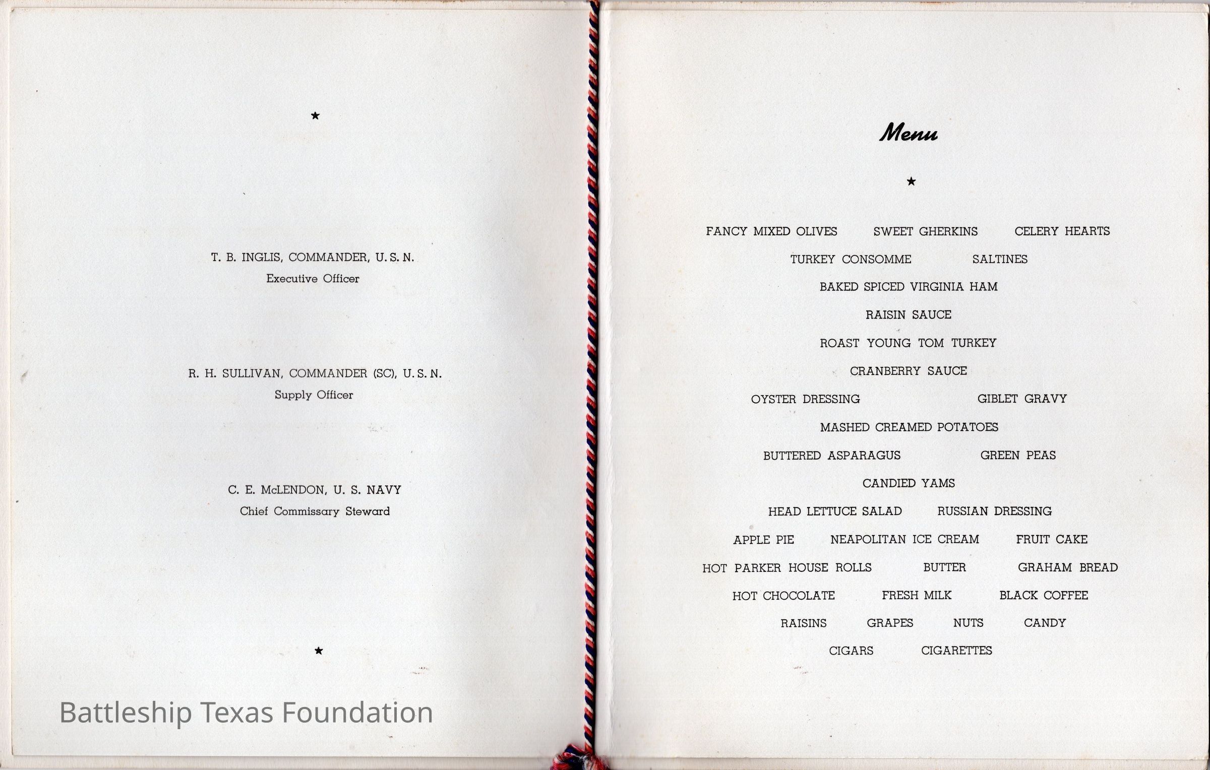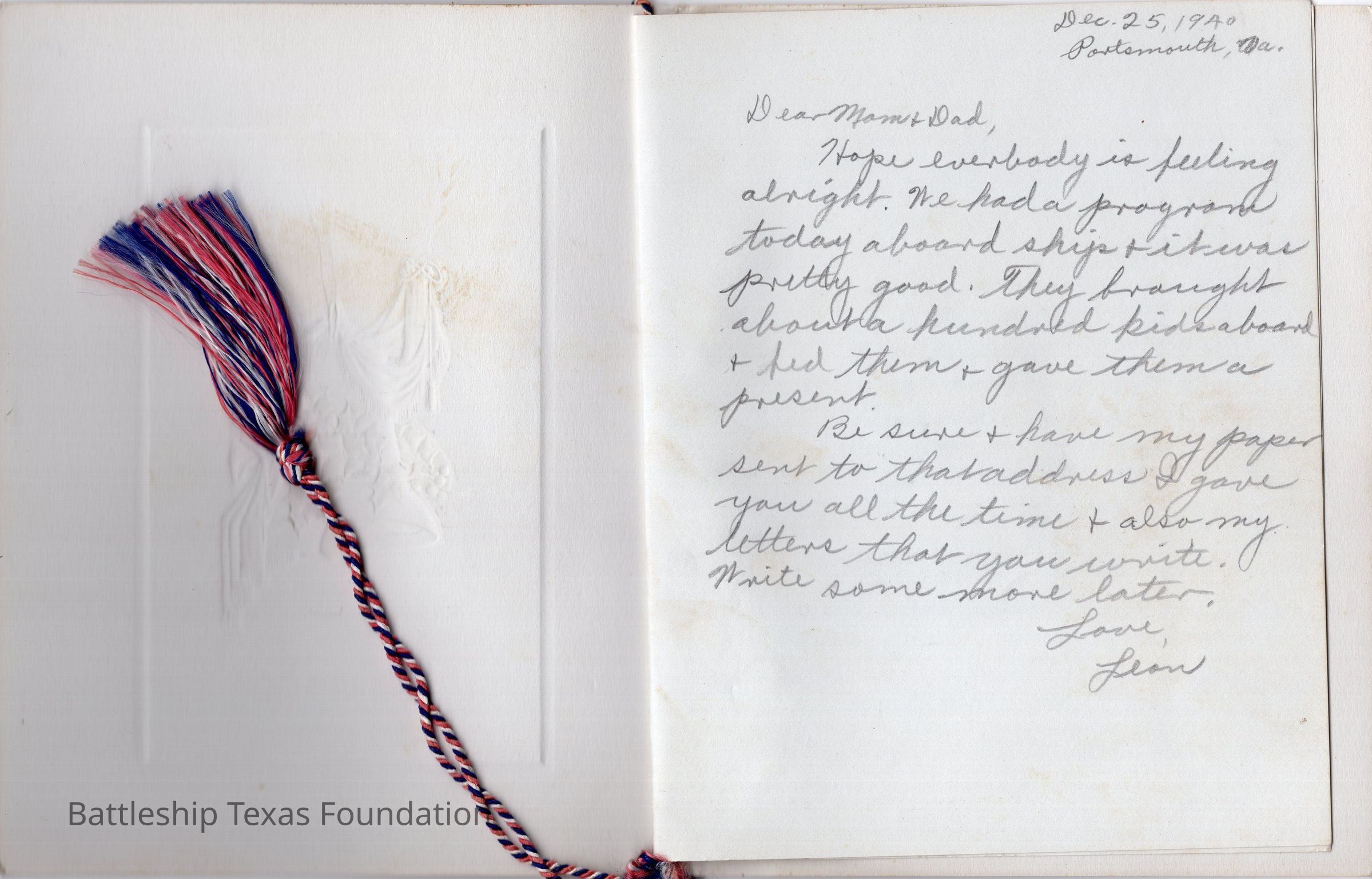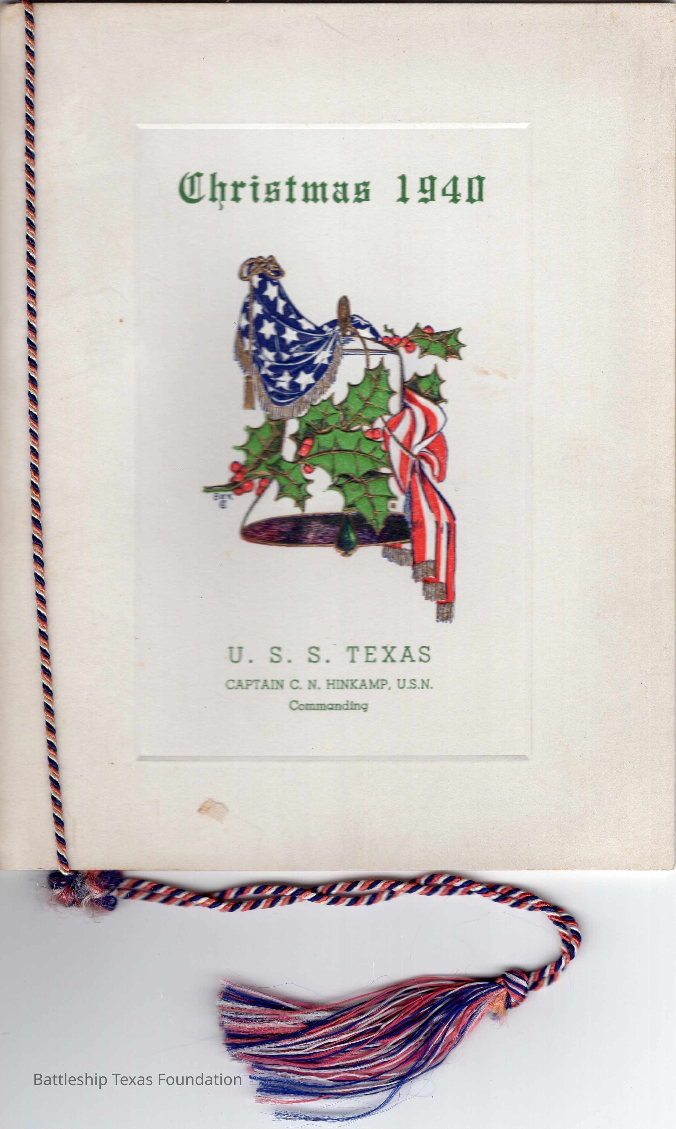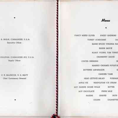 Menu for Christmas 1940. On the inside there is a letter by Jean to his mother and father dated December 25, 1940, when the ship was in Portsmouth. Interior has the menu for Christmas dinner. Braided string on holding both parts together with a tassel hanging off.Context