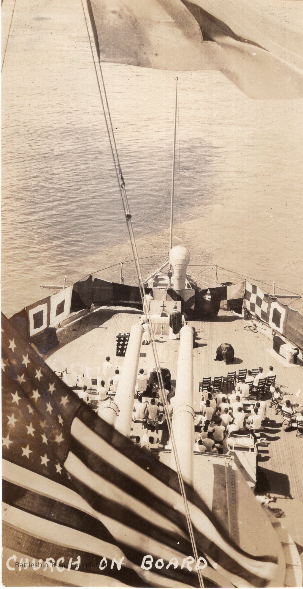 Features a church service with the pulpit at the fantail.Context