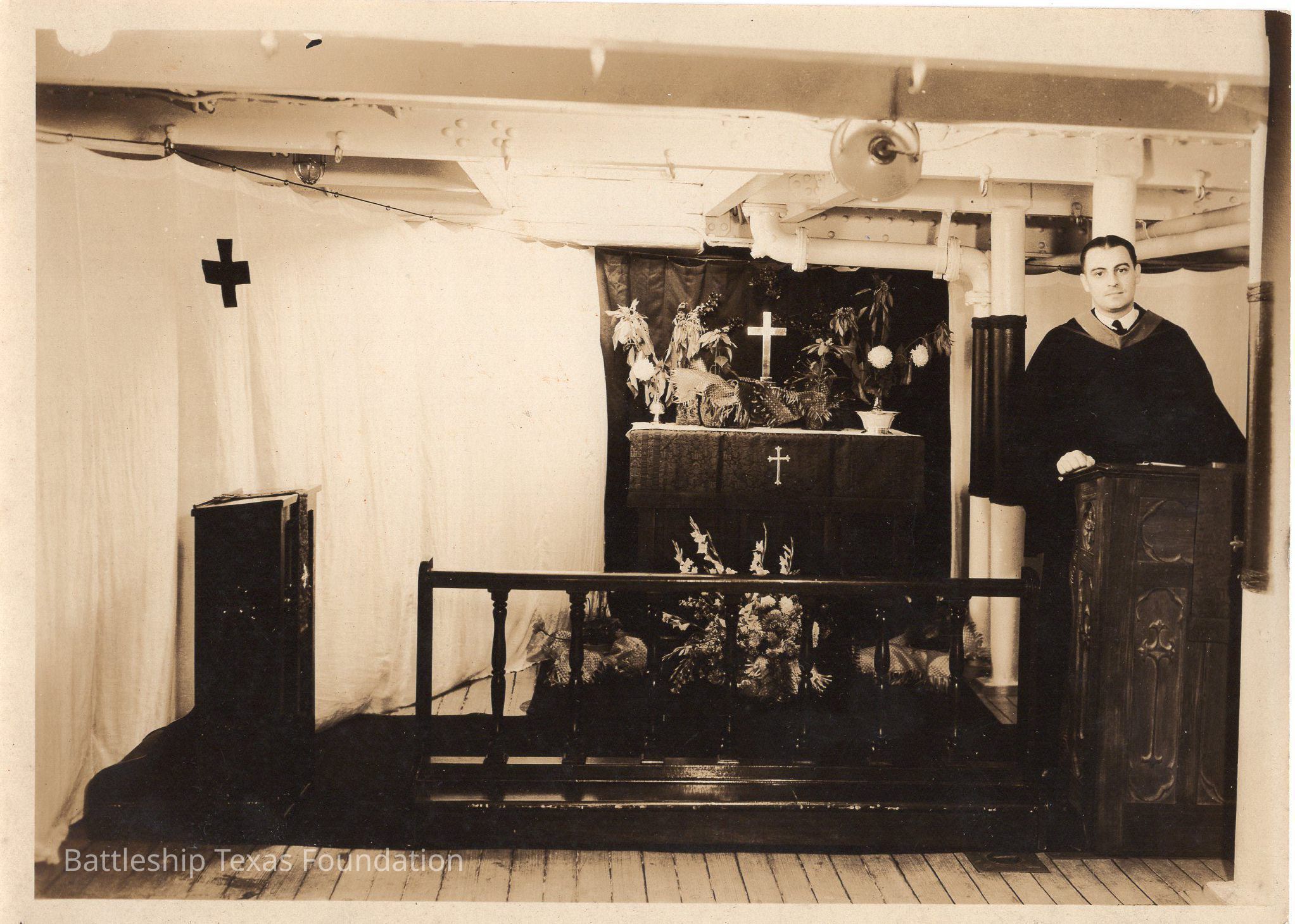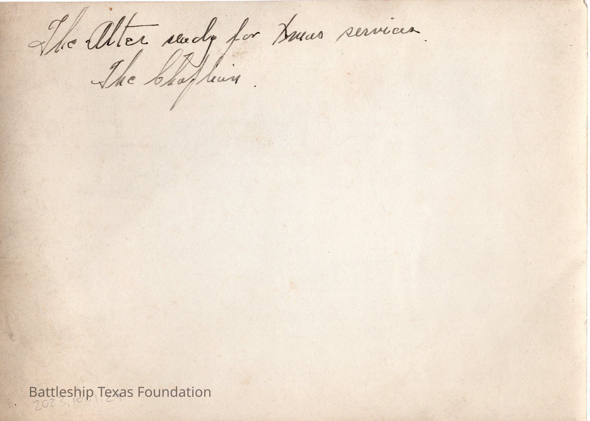 Alter in ship compartment with chaplain/preacher on right. White sheet with Greek cross on left. Back says "the alter stage ready for Texas services..."