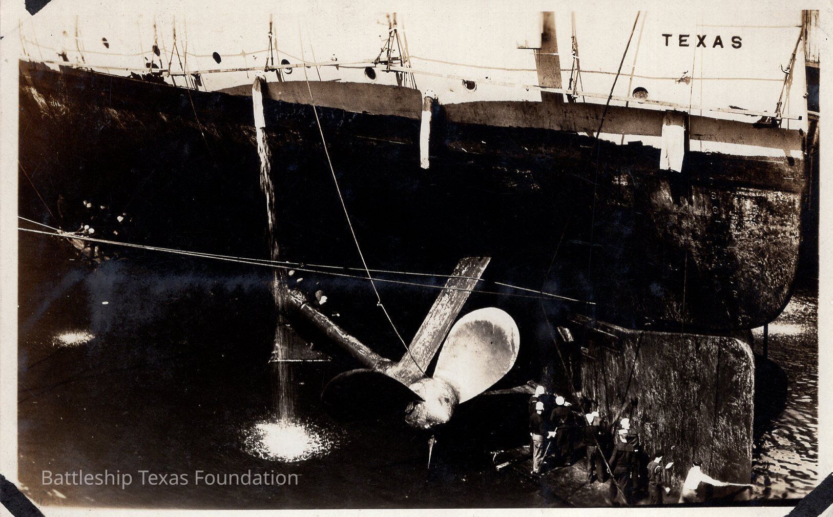 Features stern of Texas with water flowing out over the starboard propeller. Several men work on rudder.Context