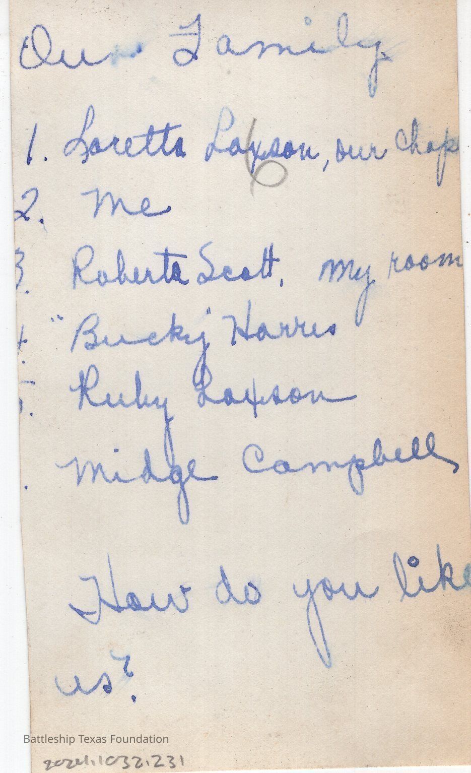 From a donated collection of individual photographs and pages out of a Texas crewmember's photo album. Items donated by the Los Angeles Maritime Museum.