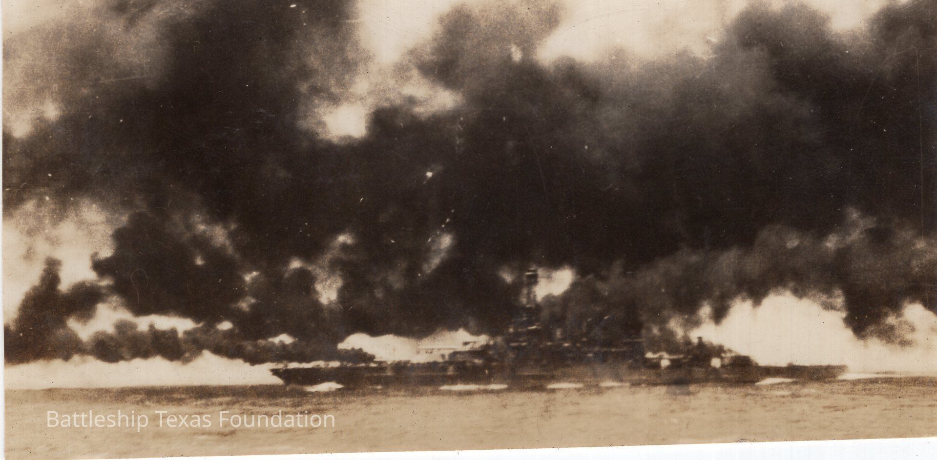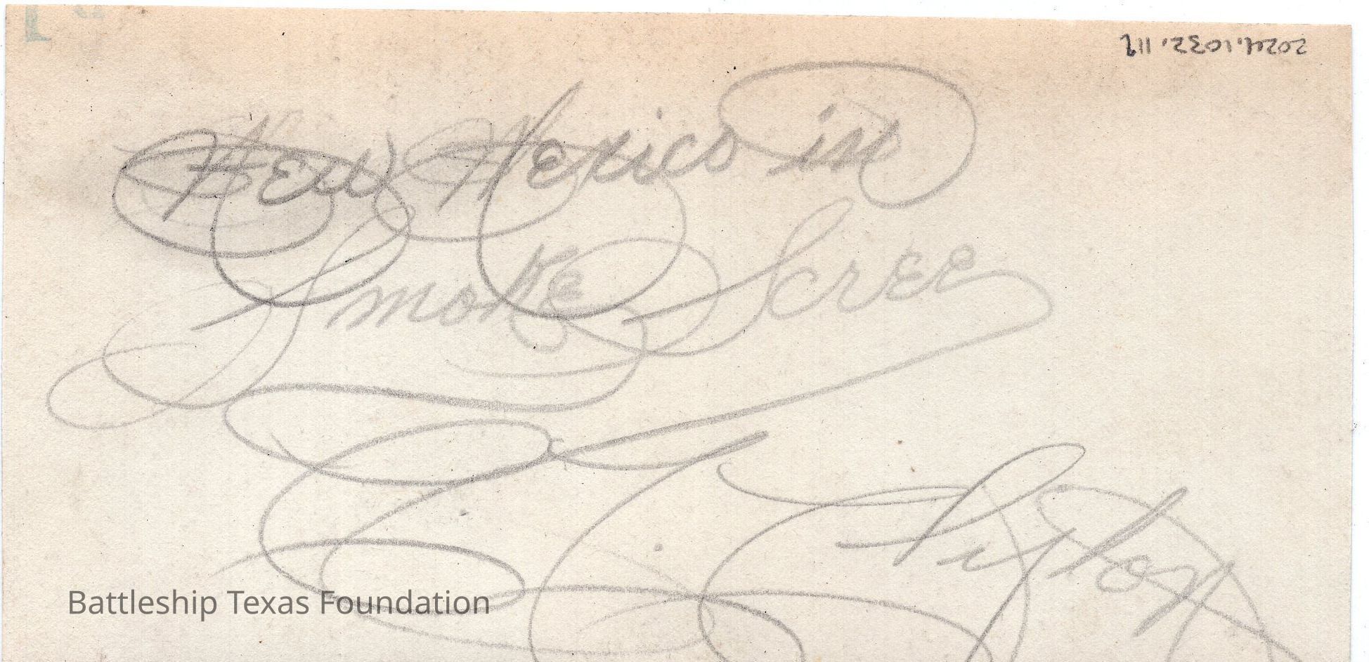 From a donated collection of individual photographs and pages out of a Texas crewmember's photo album. Items donated by the Los Angeles Maritime Museum. Many photographs had writing on the pages of the book, now discarded. The caption formerly on the page for this photo read, "COLORADO IN SMOKEE SCREEN"