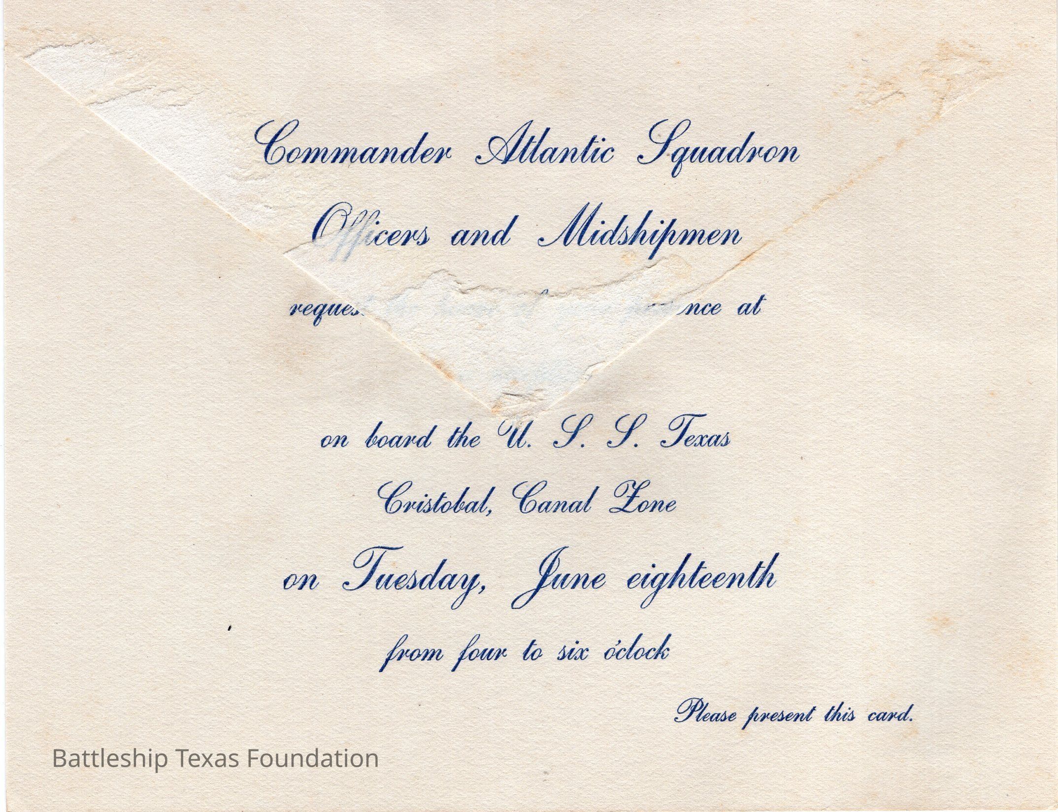 Invitation from the Commander Atlantic Squadron Officers and Midshipmen of USS Texas. The invitee is obscured due to adhesive residue on the center of the card. Invite grants entrance to USS Texas in Cristobal, Canal Zone on Tuesday, June 18th, 1935.Context