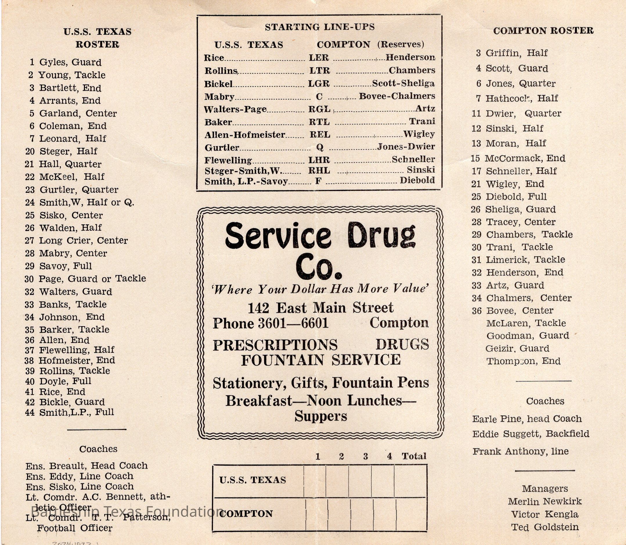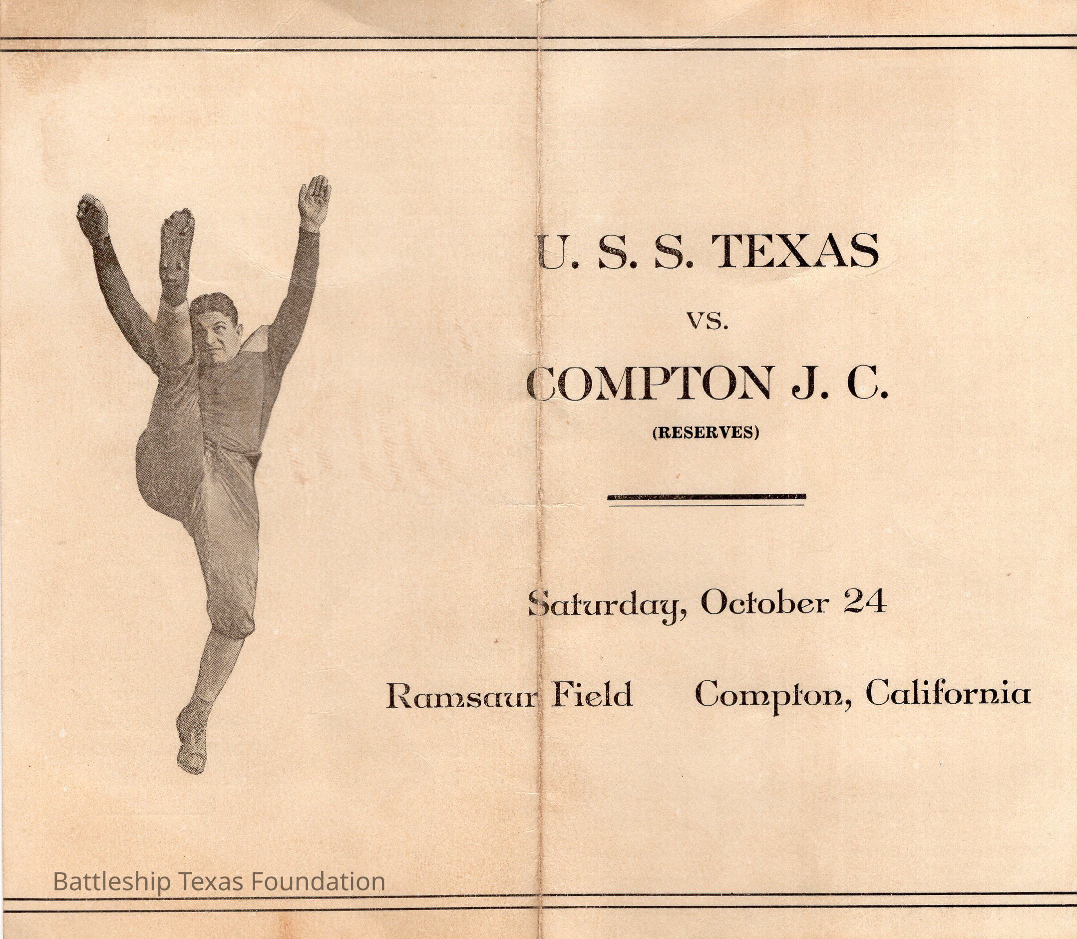 Game program for a football game between the crew of Texas and Compton Junior College. Game takes place on October 24 on Ramsaur Field in Compton, California. Program has a player doing a high kick from punting the ball on the left side of the front.Context