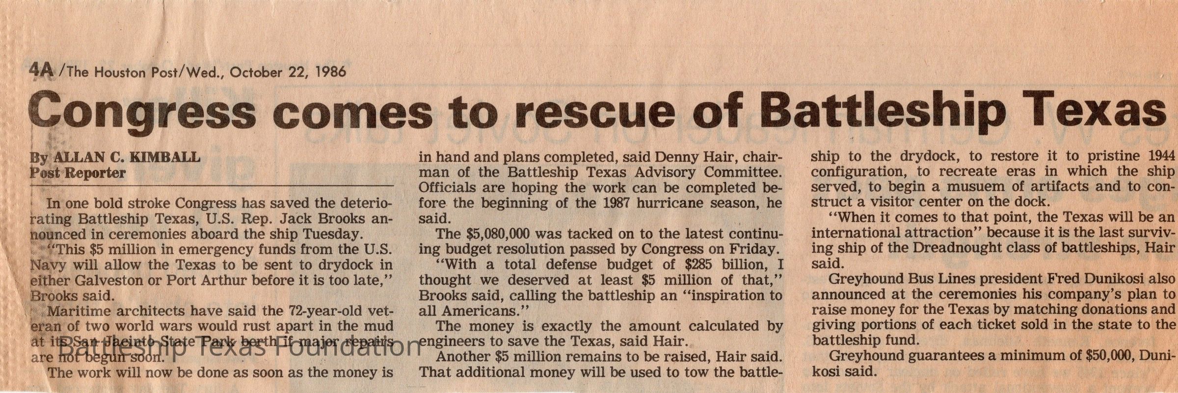 Described Congress funding of Battleship Texas restoration. Written by Allan C. Kimball on October 22, 1986.Context