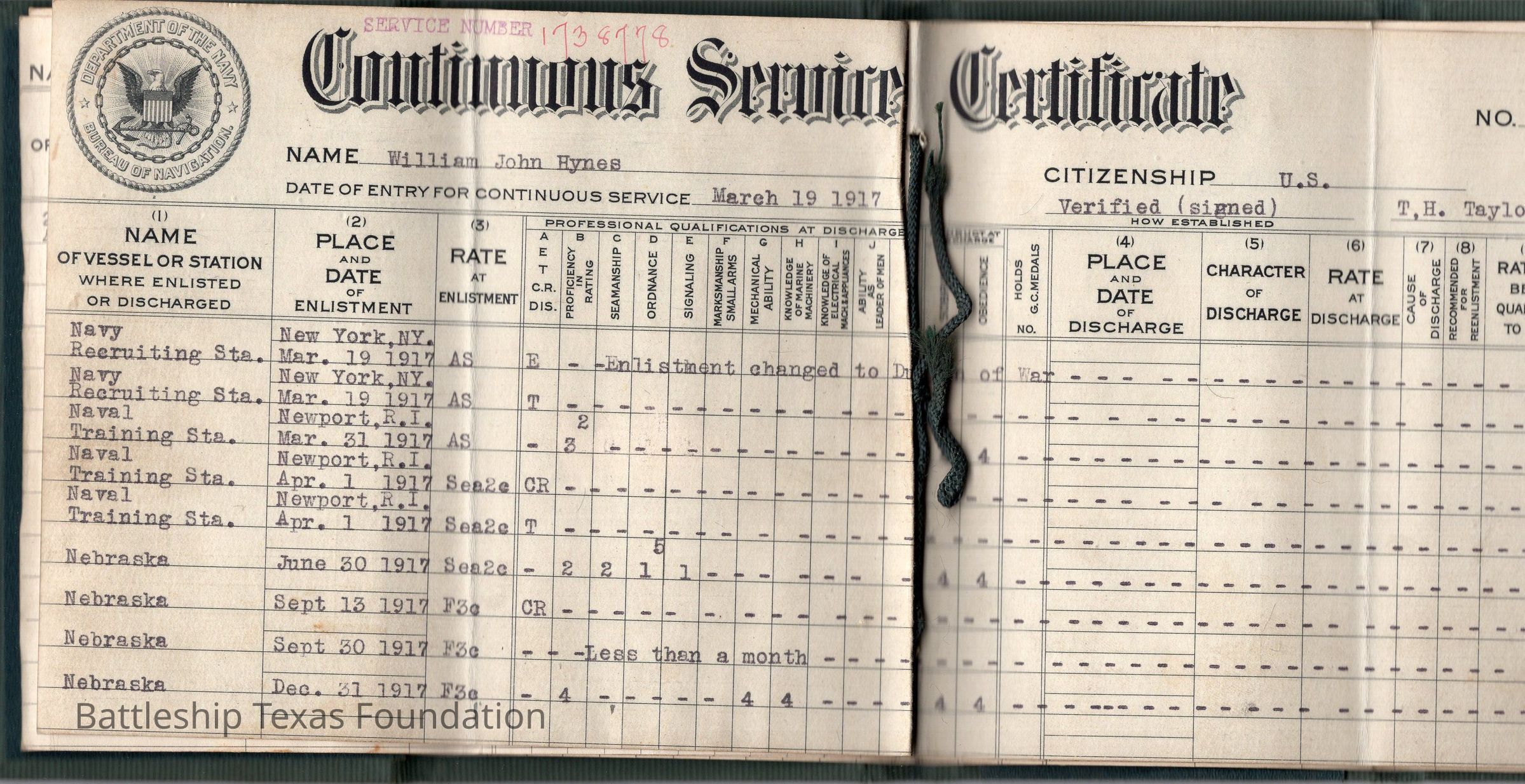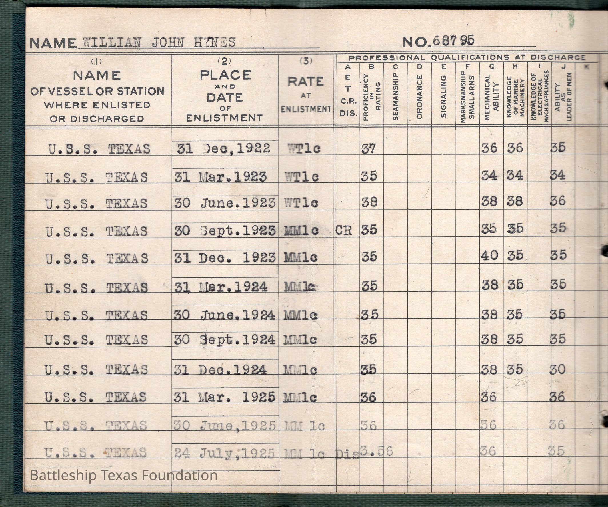 William Hynes was a veteran of World War I, who later joined the crew of Battleship Texas from December 31, 1922, to July 24, 1925. He joined the crew as a WT1c and left as a MM1c.