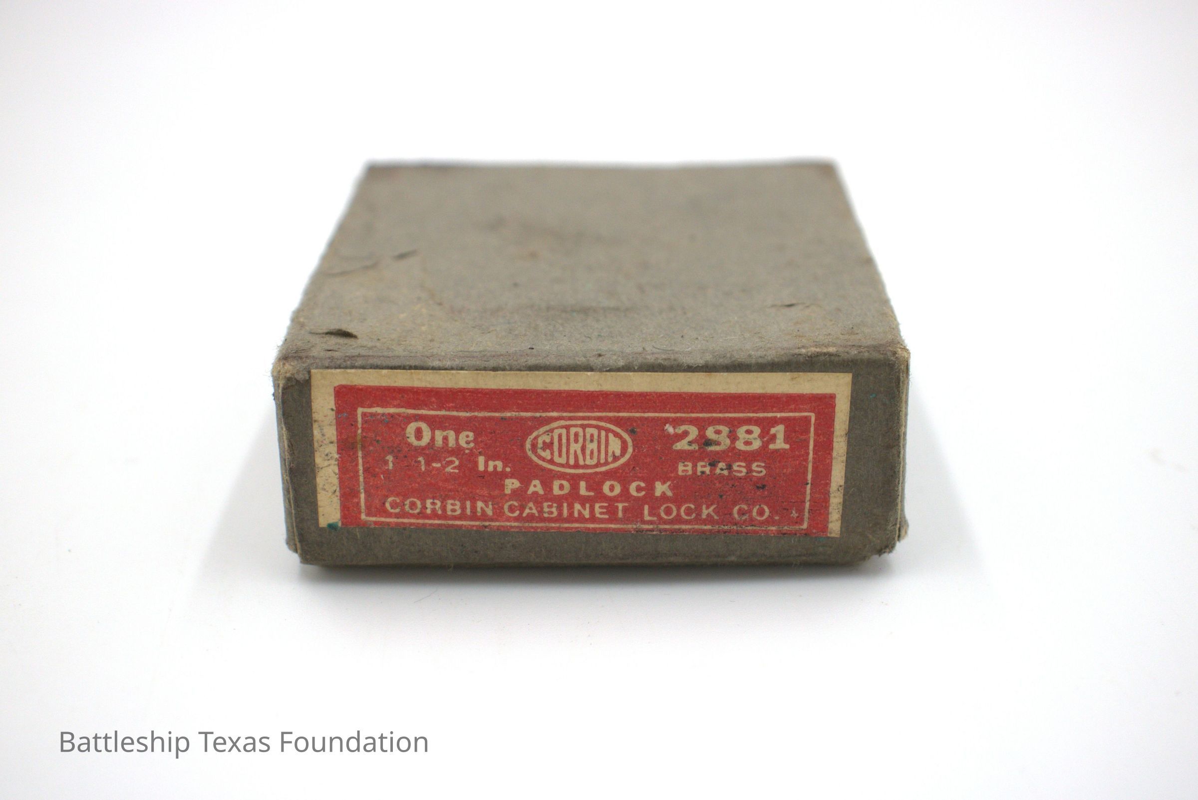 Box used by Charles Pratt to hold buttons and stored in the bicorne hat box. Originally made by Corbin Cabinet Lock Company. Gray with red label.Context