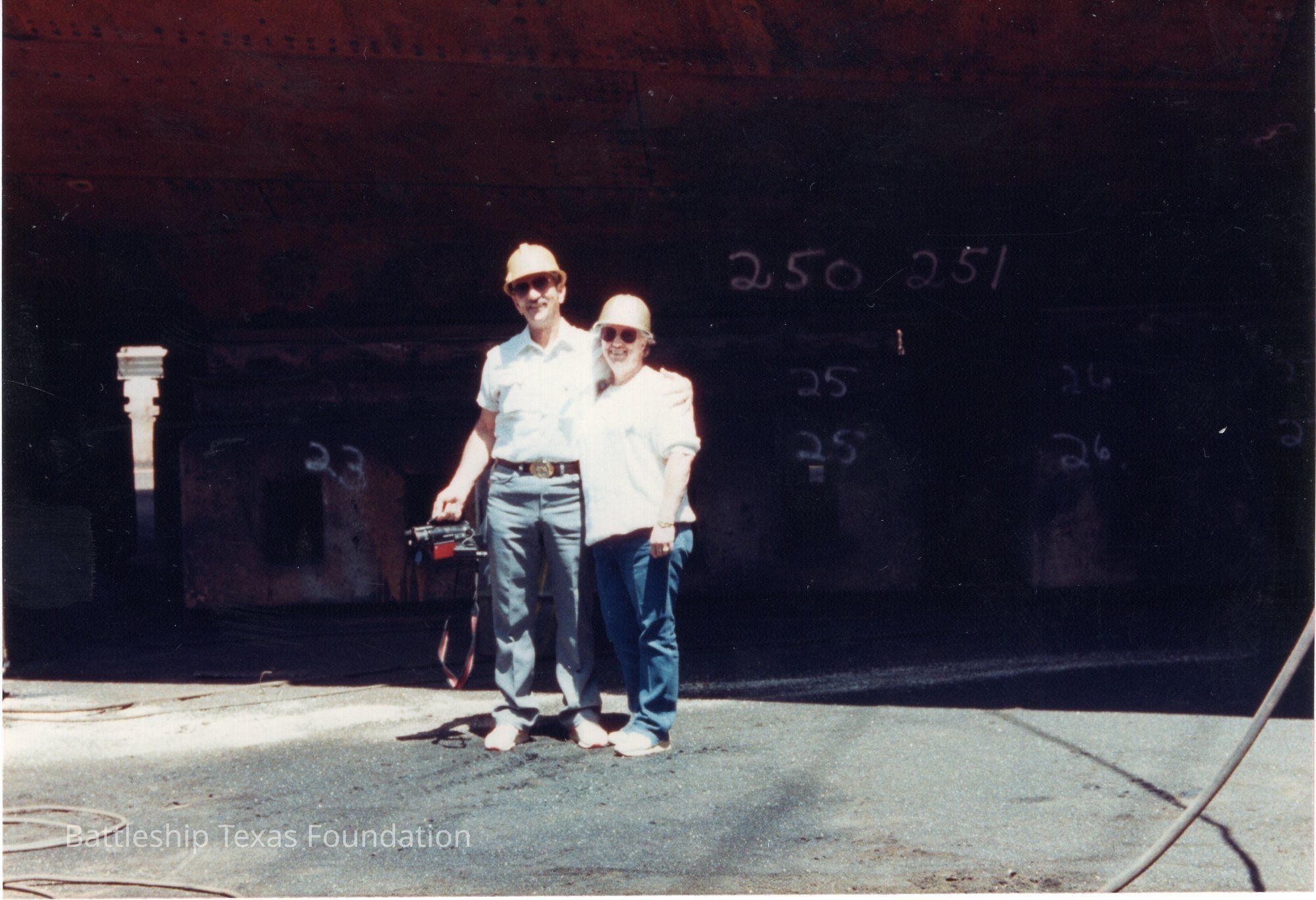 Couple in white shirts and hardhats stand in blasting media underneath Battleship Texas. Man is holding a camera.Context