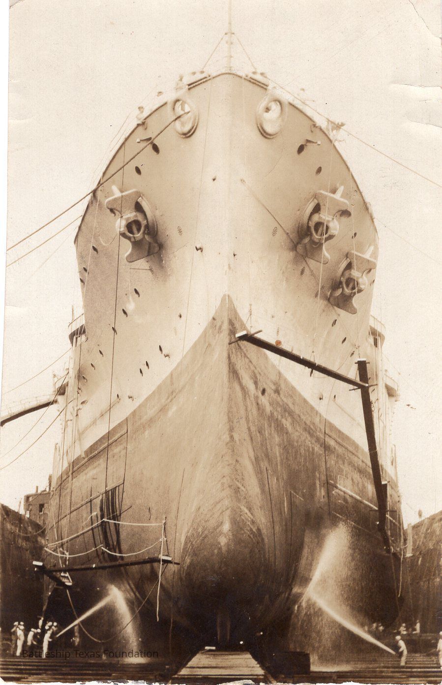 Texas bow forward in dry dock. Two teams spray hull. Rigging around bow.