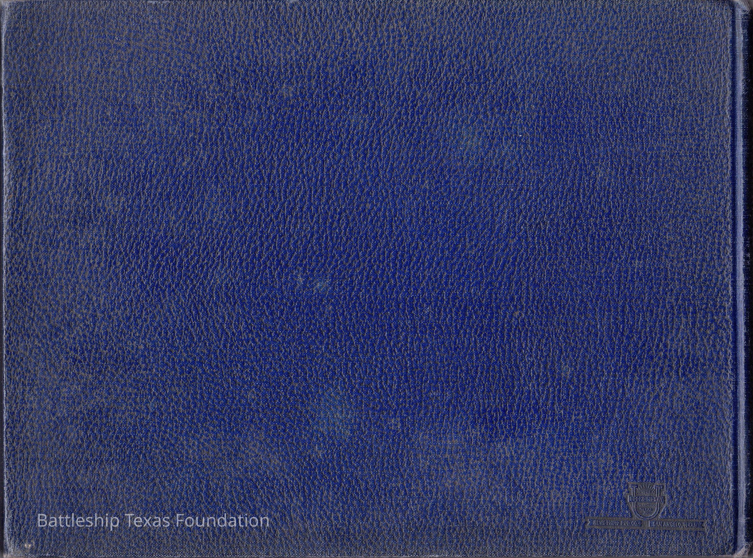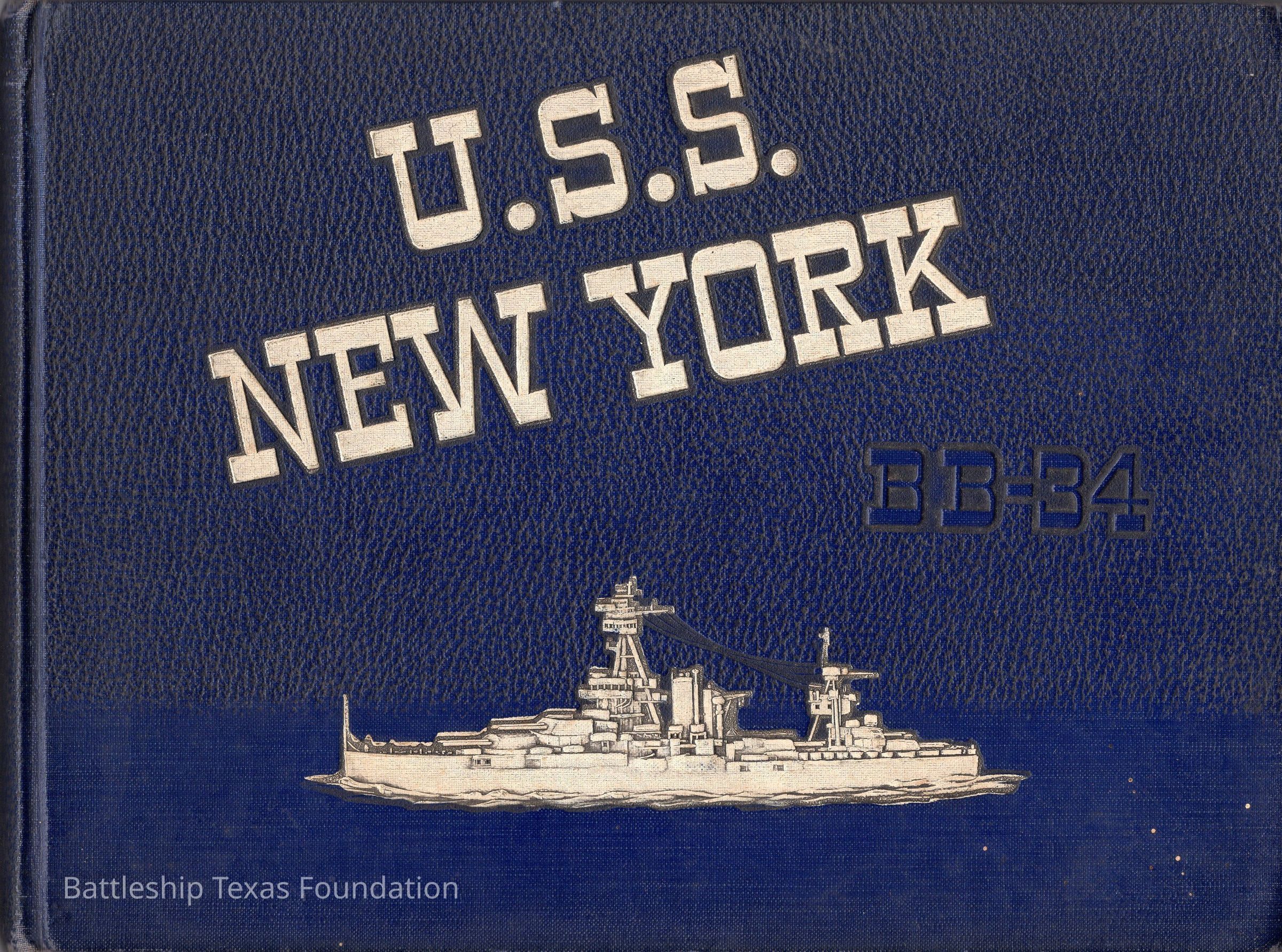Cruise book of the last deployment of the ship during World War II, ending at the ship's departure from New York City to Bikini Atoll. Blue cover with detailed leather decal of Battleship NY. Filled with photos, typically four per page.Context