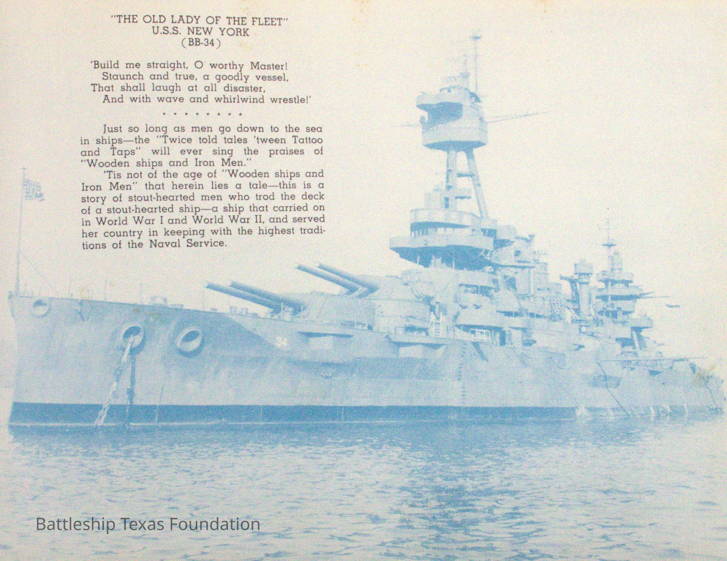 USS New York (BB-34) was the sister ship of USS Texas, and the lead ship of the New York-class battleships. She was commissioned from May 15, 1914, to August 29, 1946. She participated in the nuclear testing at Bikini Atoll on June 1, 1946, and was sunk as a target ship on June 6, 1946.