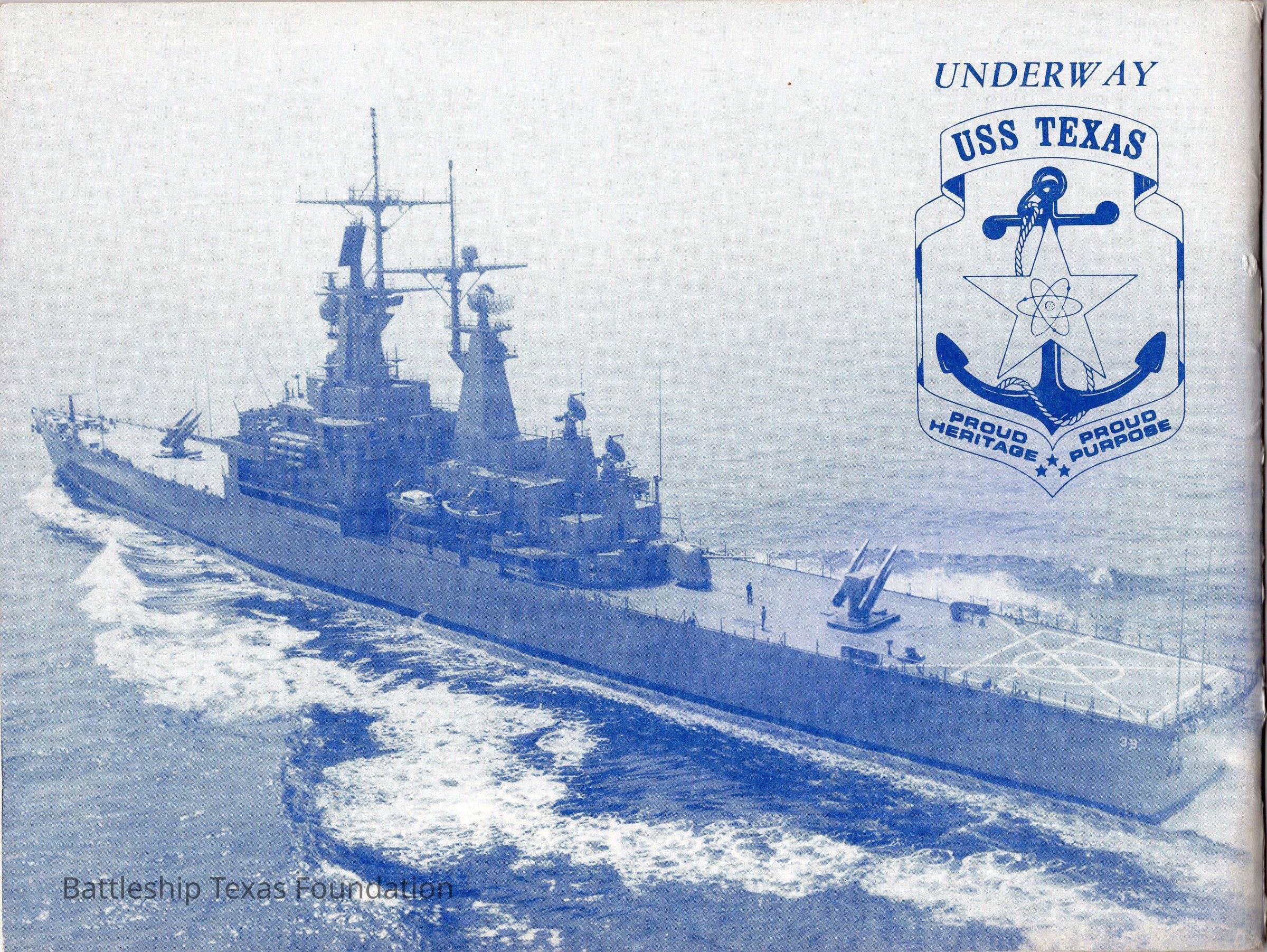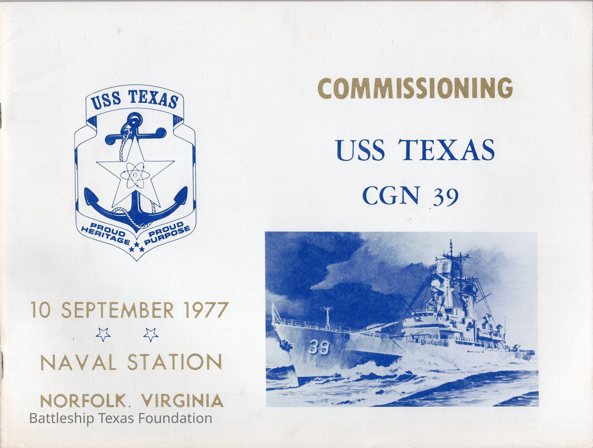 Booklet for the September 10, 1977 commissioning of the USS Texas (CGN-39). It explains the history of ships names "Texas", the role CGN-39 would fulfill, and the officers that would crew her.Context
