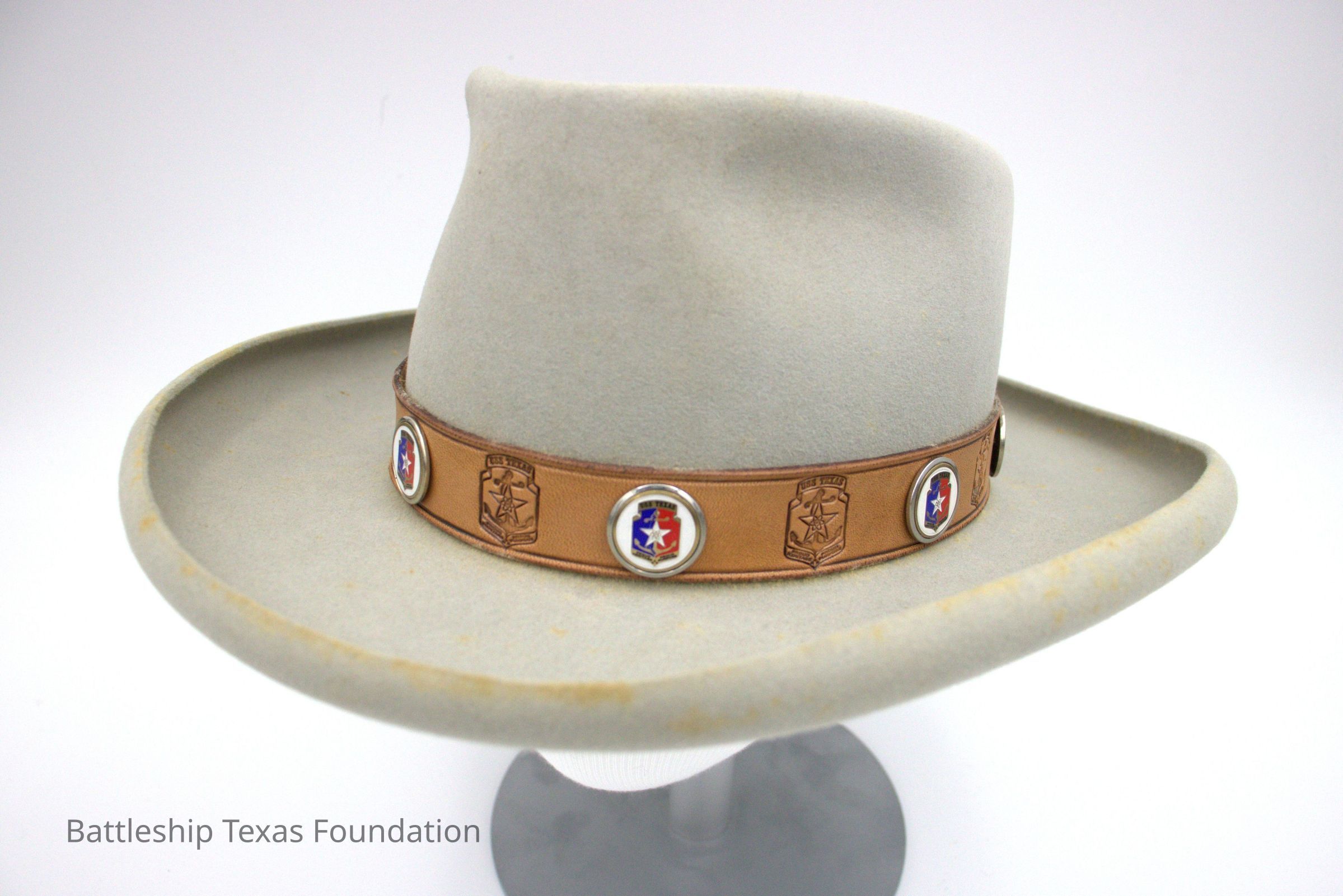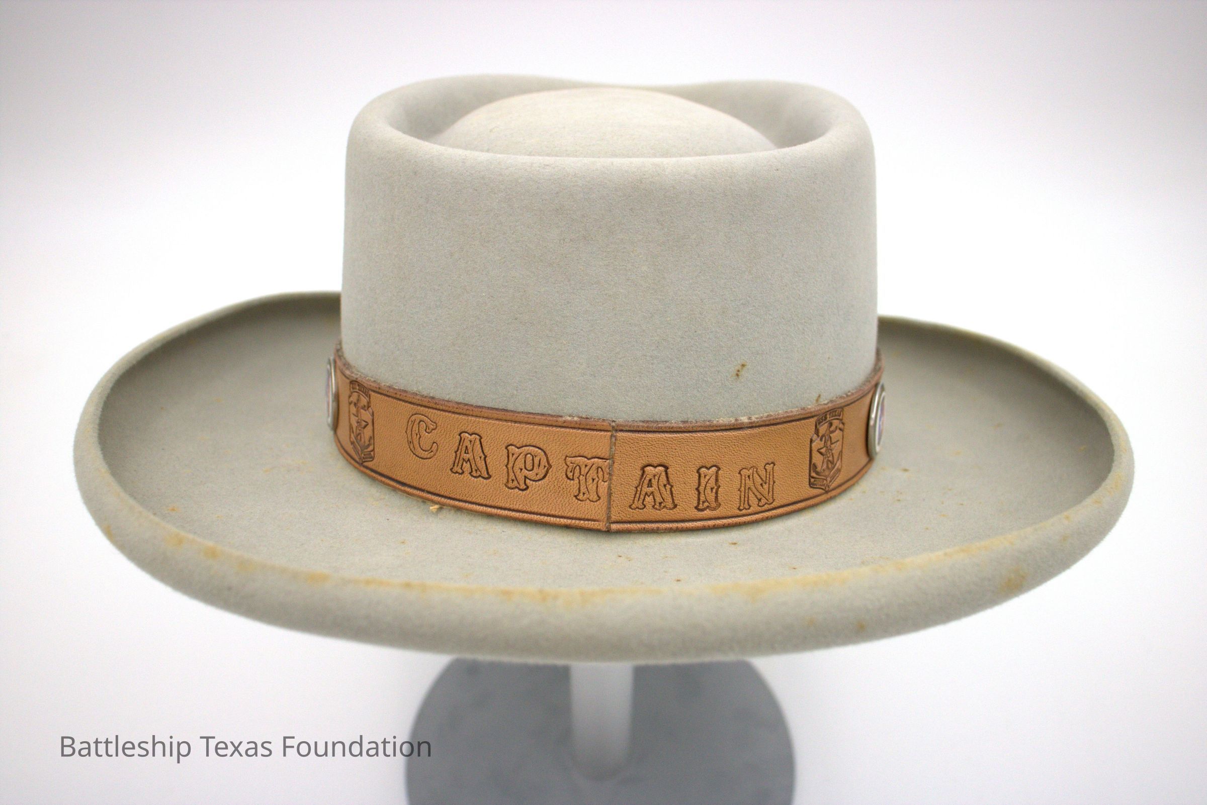 Gray cowboy hat with a brown leather band. Band has alternating Cruiser Texas emblems of it imprinted into the leather, and a circular coin with color. Back says "CAPTAIN" on the band. Hat made by the Texas Hatters.Context