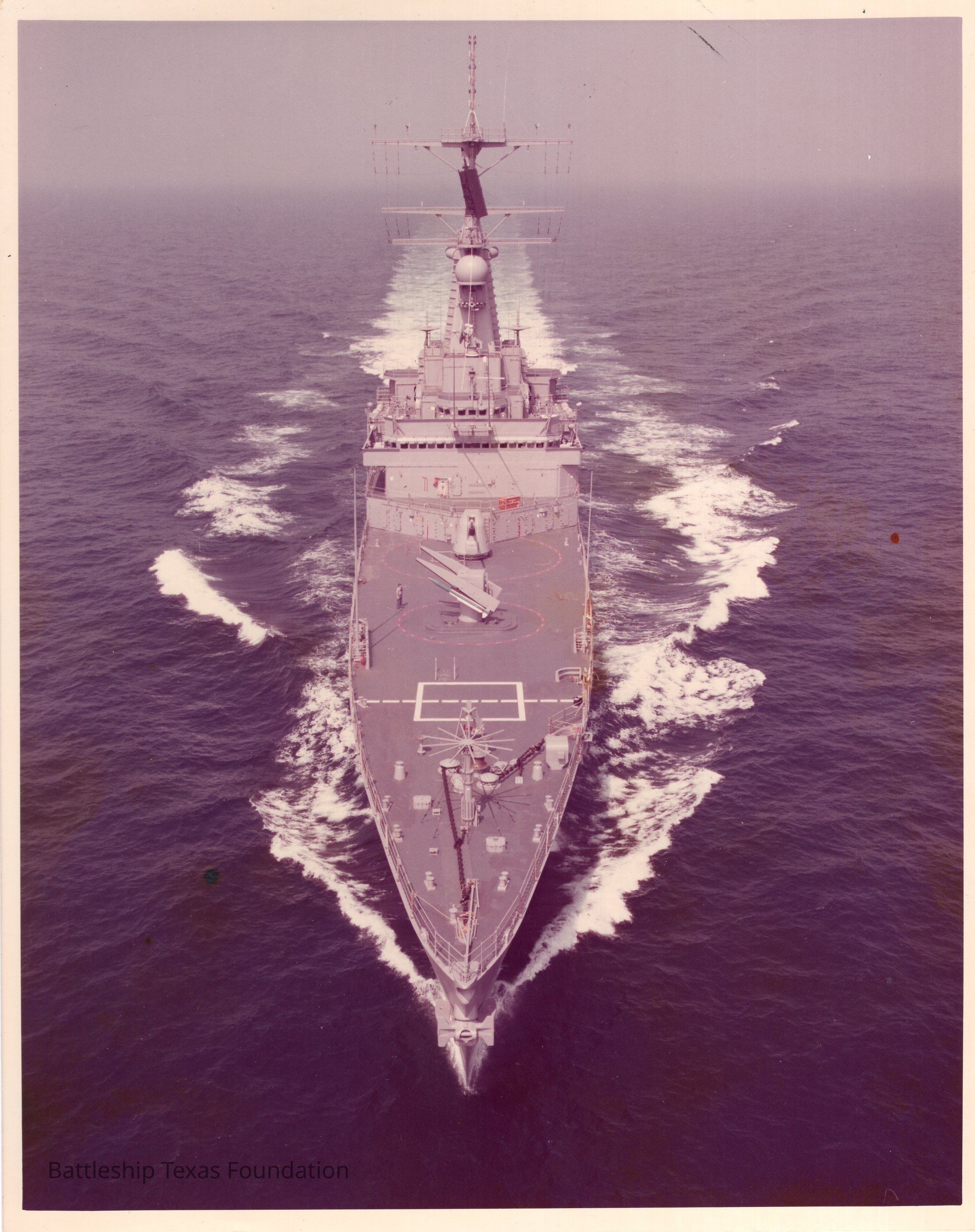 Cruiser Texas sailing towards camera. Pink hue to photo.Context
