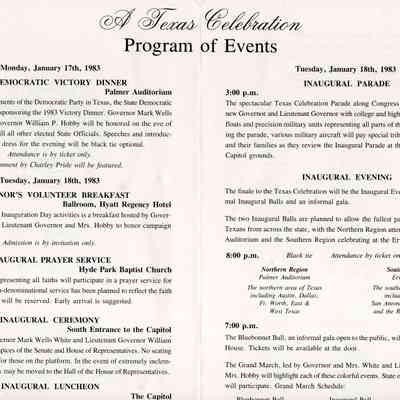 Pamphlet for the 1983 Texas inaugural festivities celebrating the Democrat's victories in the state.Context
