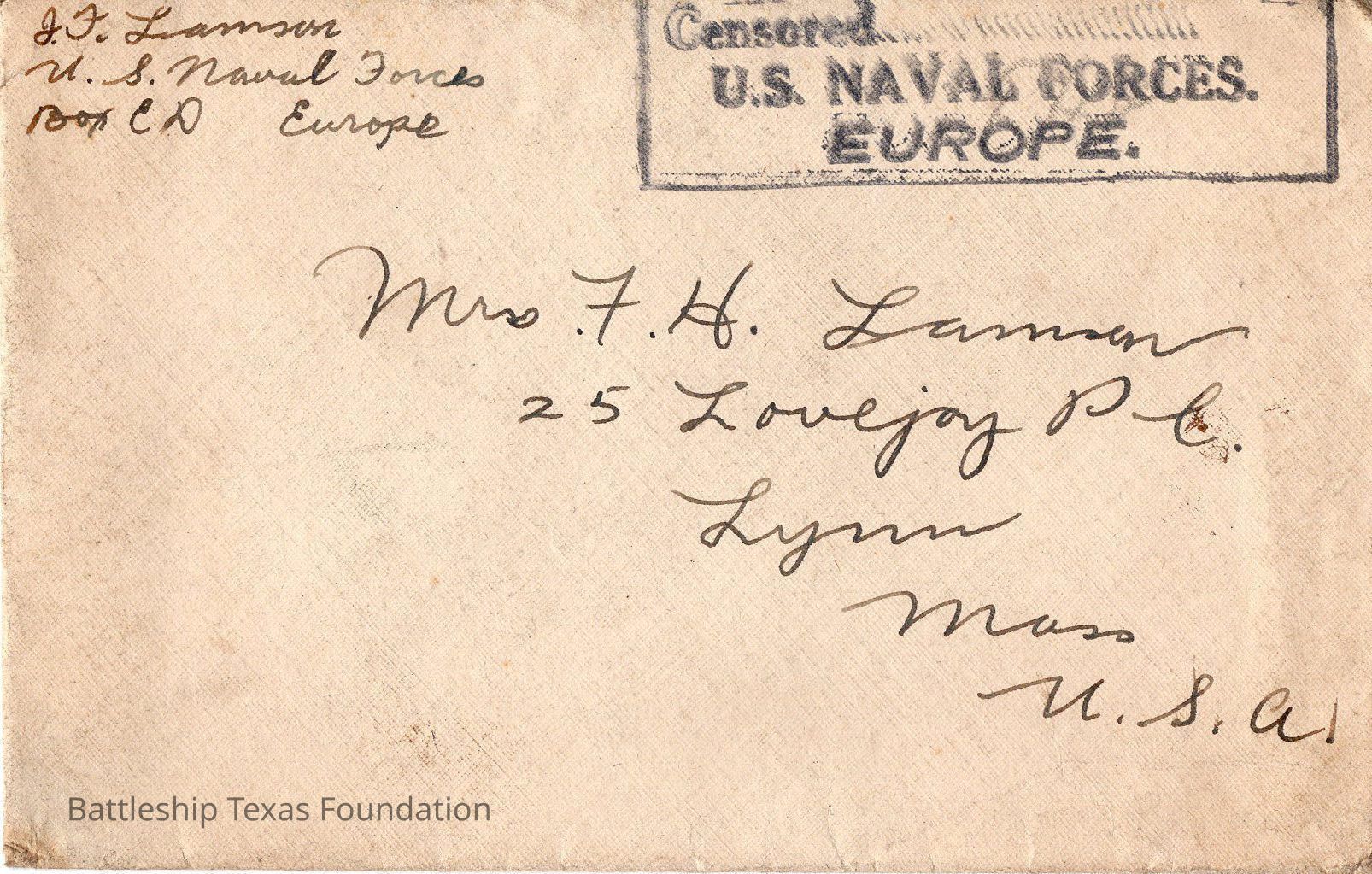Stamped "Censored...U.S. NAVAL FORCES. EUROPE." and addresssed to Mrs. Lamson.Context
