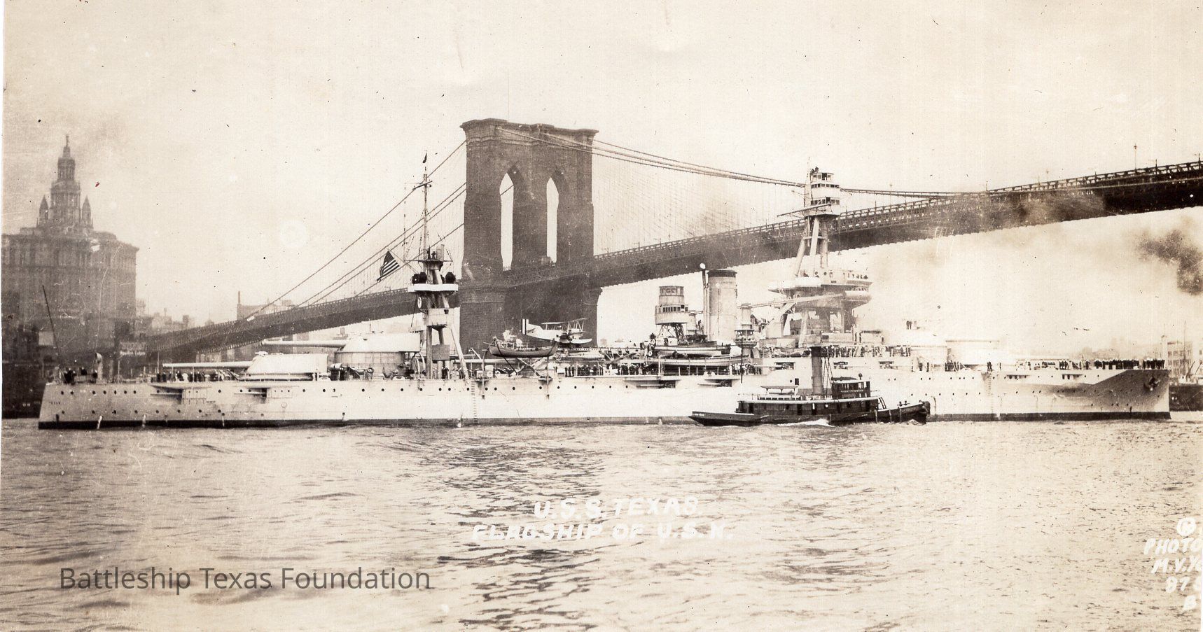 Texas in front of bridge. Tug boat in front of Texas. Captioned "U.S.S. TEXAS FLAGSHIP OF U.S.N."Context