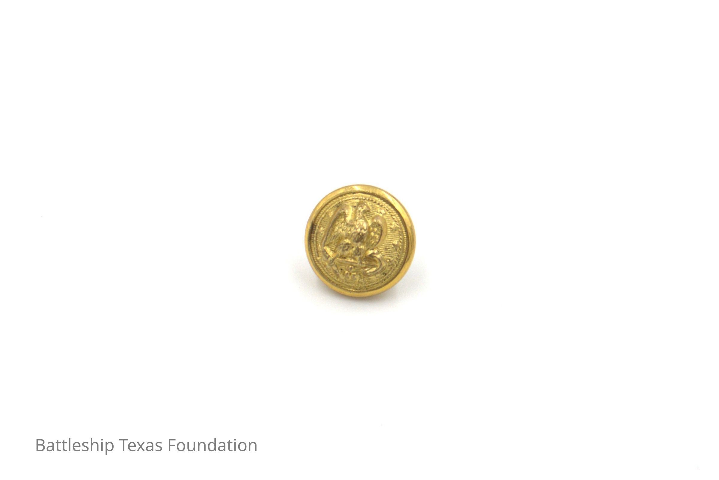 One of fifty-two individual gold buttons owned by Charles R. Pratt as spares for his USN overcoats. Button features an eagle perched on an anchor on the front. This variety is smaller than the regular size.