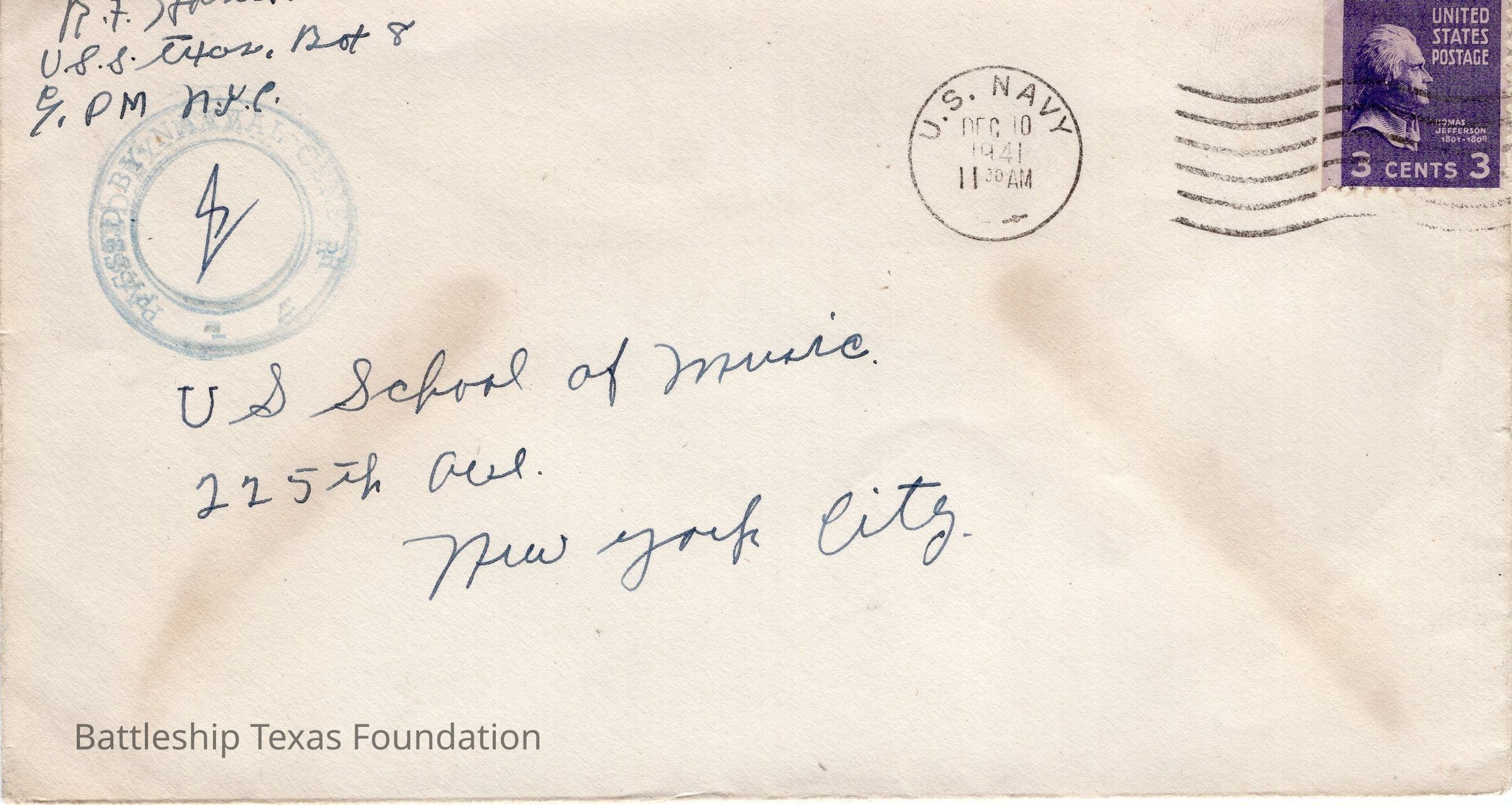Addressed to US School of Music. Envelope sent from USS Texas on the morning of December 10, 1941.Context