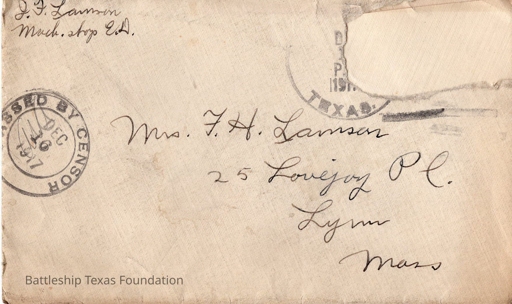 Envelope stamped "PASSED BY CENSOR DEC 16 1917" and also with the "U.S.S. TEXAS" stamp that has been torn.Context