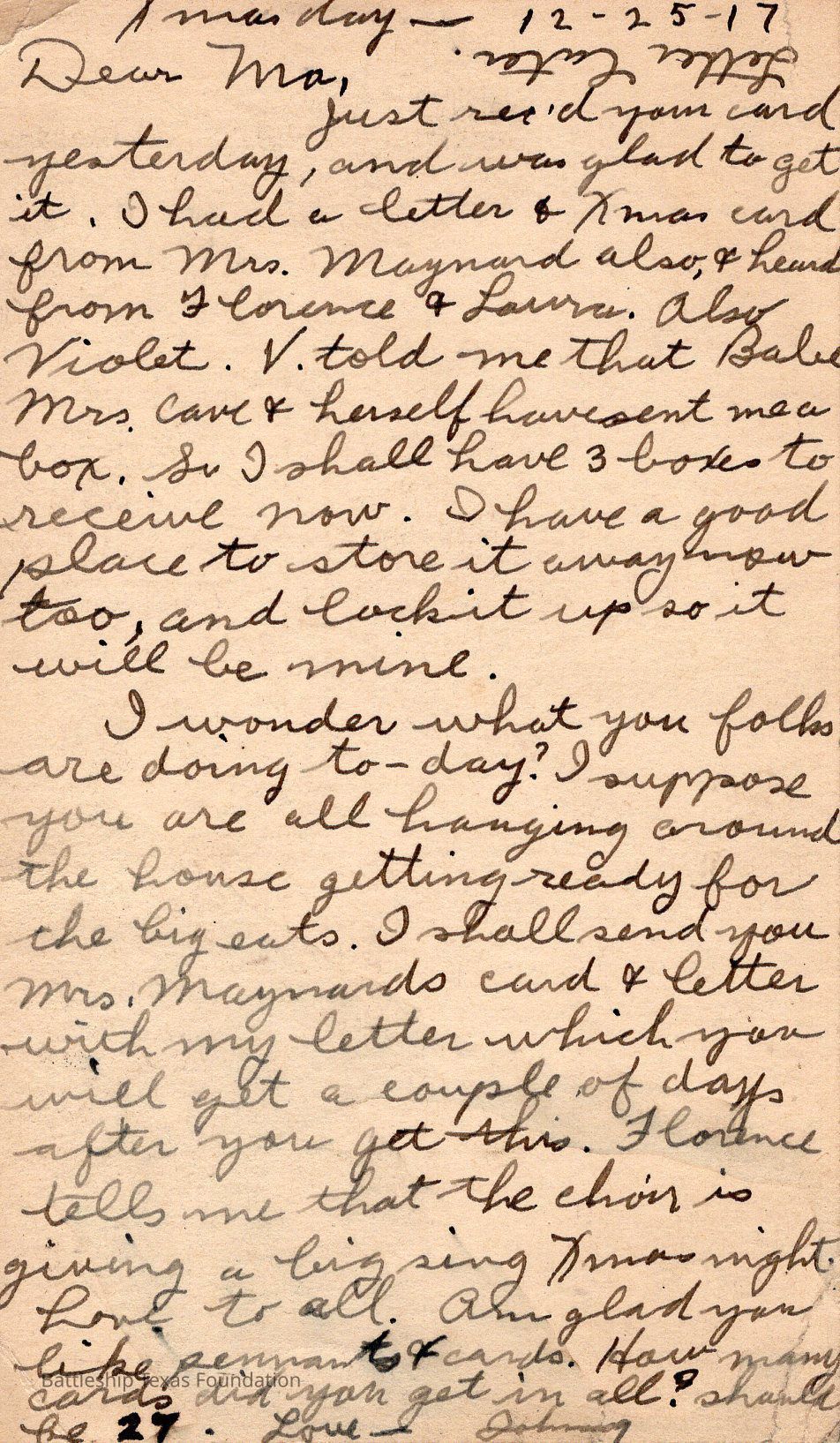 Stamped "PASSED BY CENSOR DEC 25 1917" and addressed to Ma.Context
