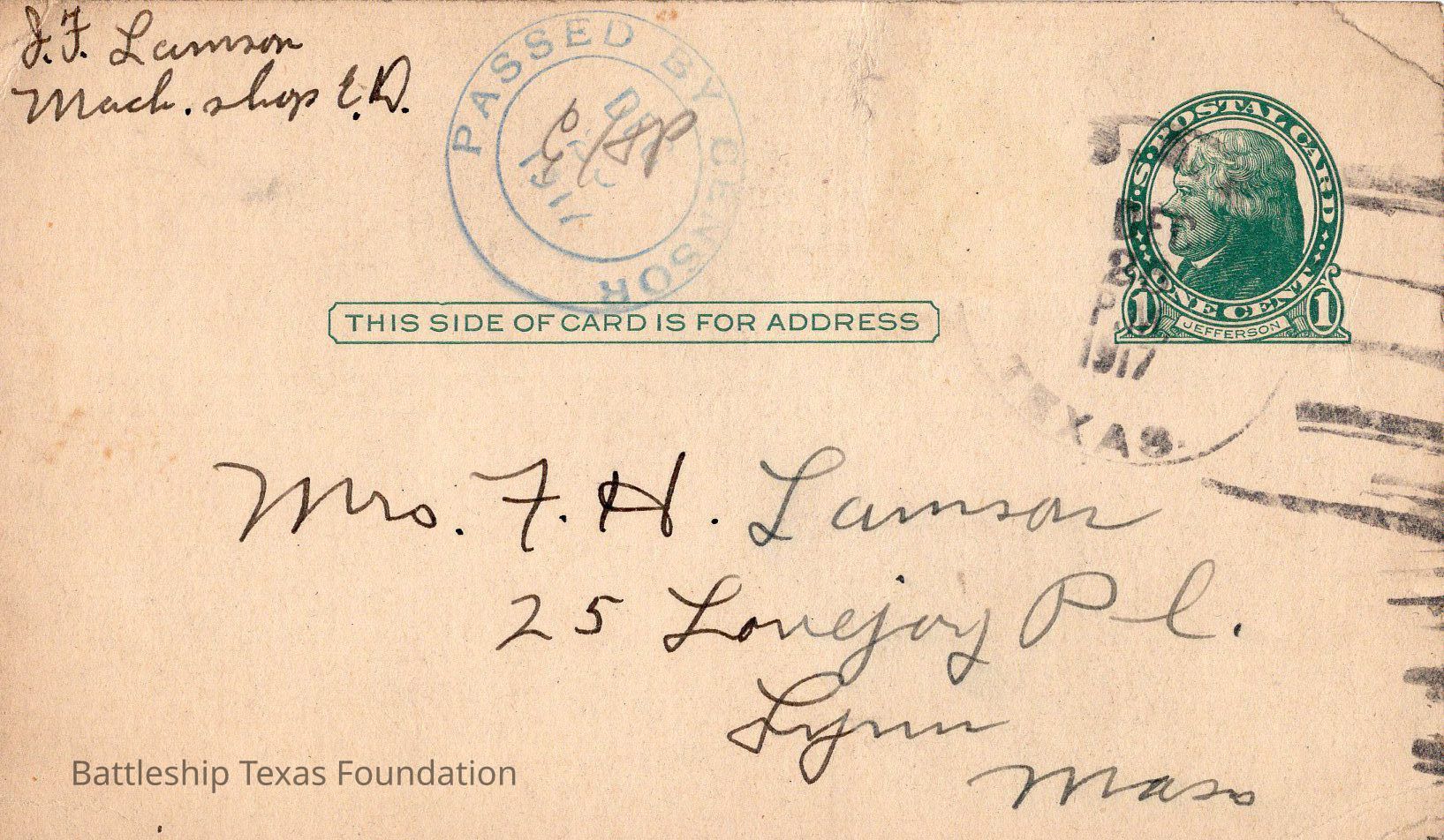 Battleship Texas had her own post office. All mail passed through a censor before leaving the ship. Once the package is checked, it was stamped with a “U.S.S. TEXAS” stamp. If in a port, mail could carry the markers of the post office on shore.Collection