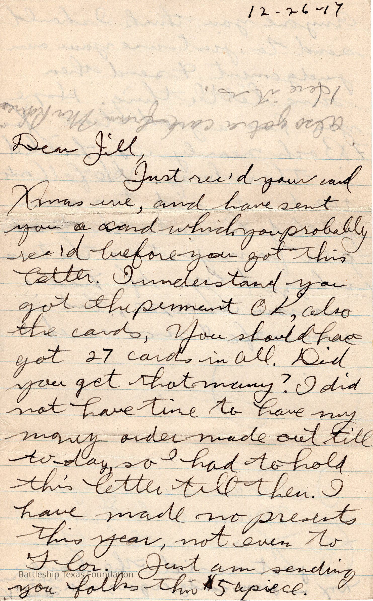 John Lamson was a MM1c on Battleship Texas from May 1917 to June 1919. Throughout his time on Texas, he sent a letter to his family at least once a week, often more. Longer stretches of absence are explained either by movement across the Atlantic, or with the Grand Fleet.