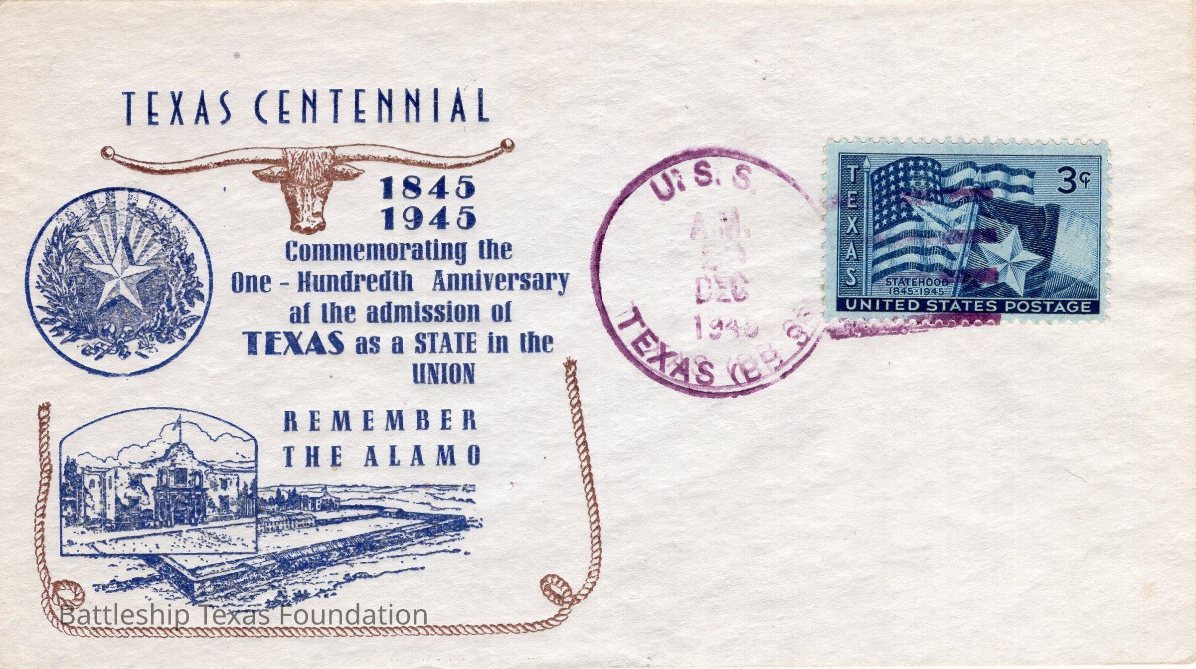 Envelope sent from USS Texas on the morning of December 29, 1945. Features a stamp commemorating Texas's 100th anniversary of joining the Union. Stamp is divided as follows