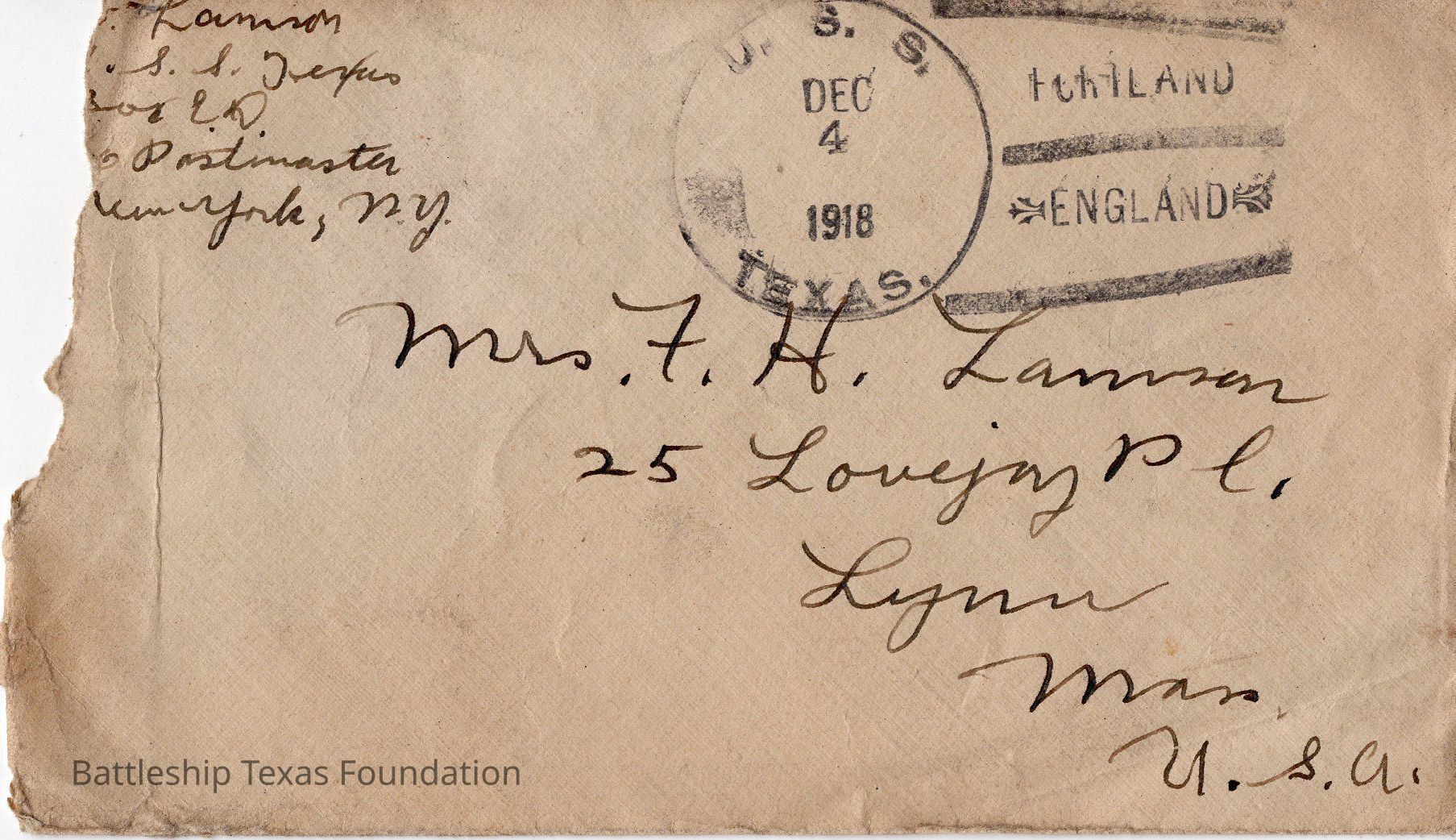 Envelope stamped "U.S.S. DEC 4 1918 TEXAS" and "PORTLAND ENGLAND"Context