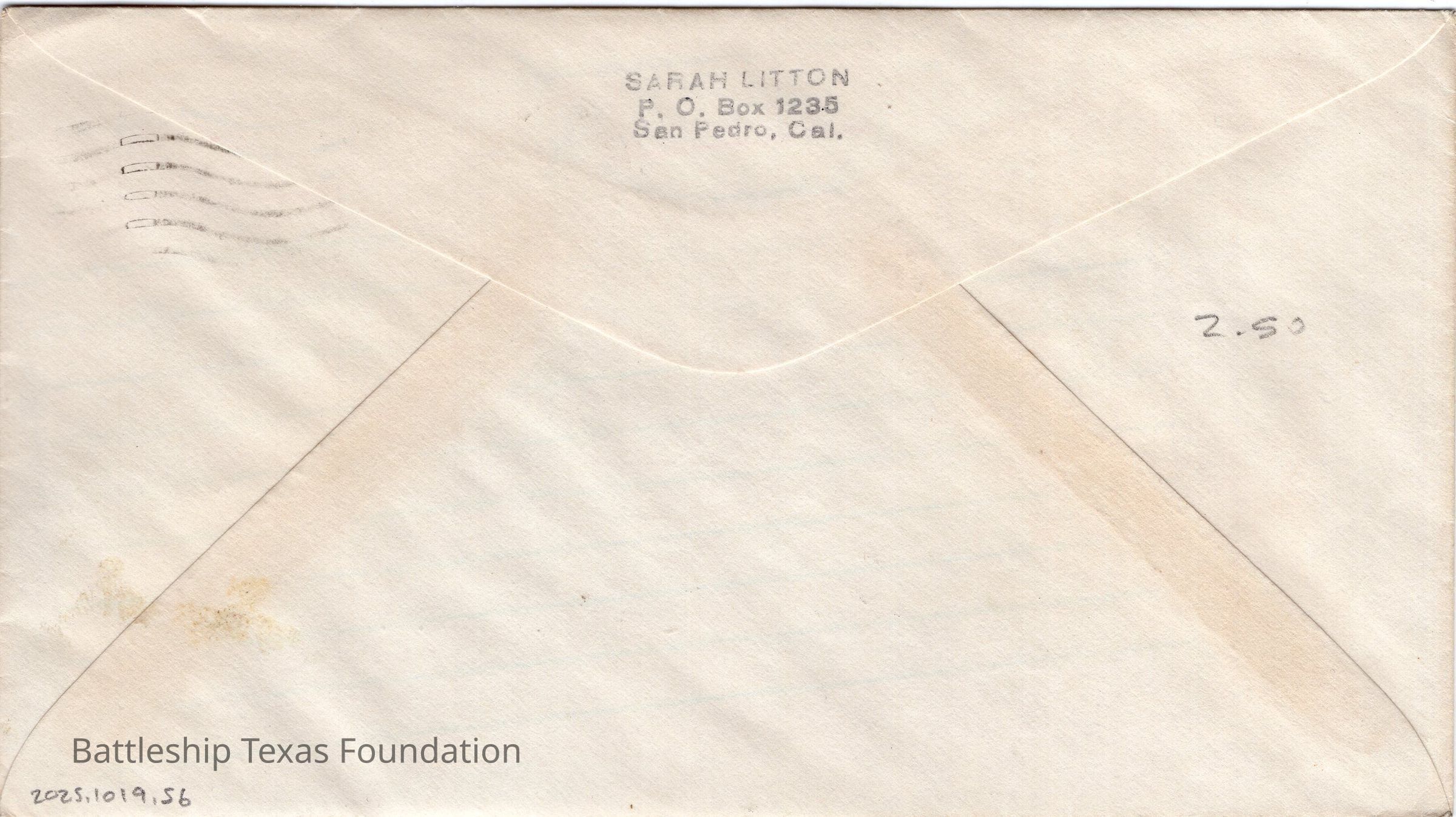 Addressed to Thomas B. Envelope sent from USS Texas on the afternoon of December 5, 1934, when the ship was in San Pedro Harbor. Features a stamp of a Colorado-class battleship with a diving plane overhead. Captioned