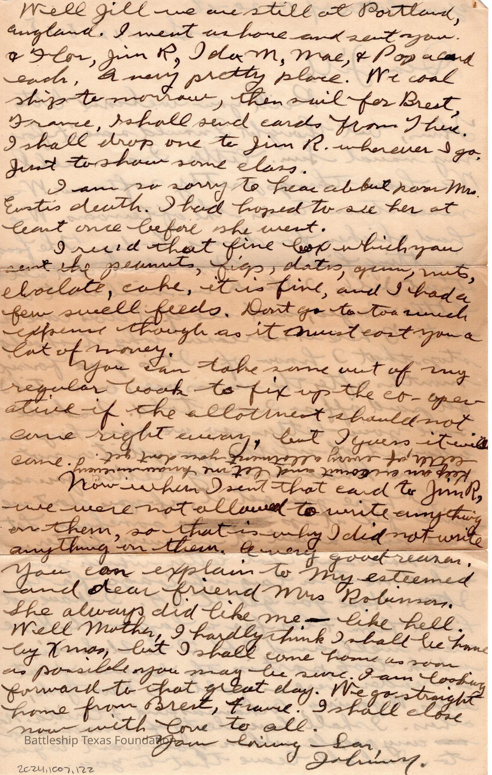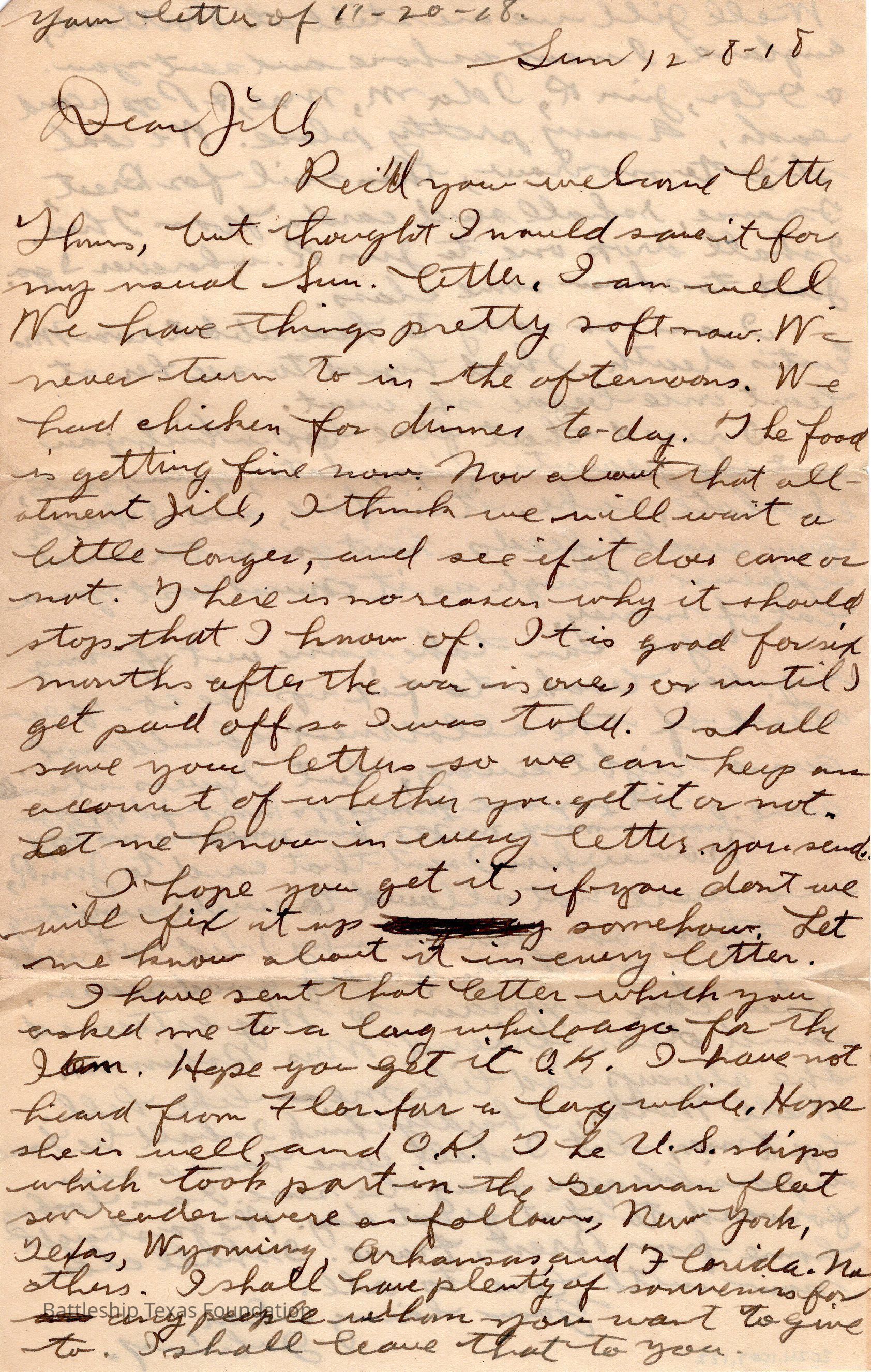 John Lamson was a MM1c on Battleship Texas from May 1917 to June 1919. Throughout his time on Texas, he sent a letter to his family at least once a week, often more. Longer stretches of absence are explained either by movement across the Atlantic, or with the Grand Fleet.